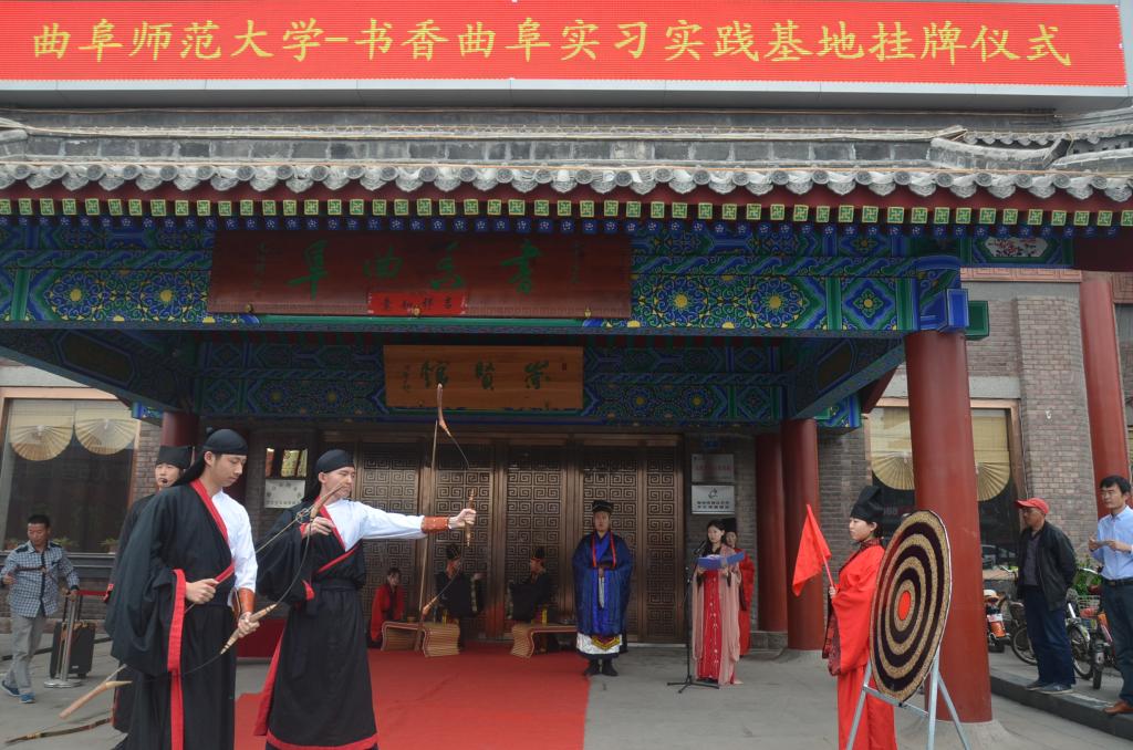 仪式期间,工口动漫 志愿者代表李怡林同学发言,葛俊岳主任、屈跃宽书记为“传统文化教育实践基地”“大学生社会实践基地”等揭牌。仪式最后,工口动漫 学生进行了射礼展演。