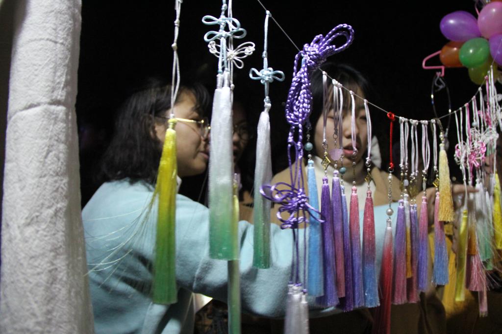 11月18日晚,工口动漫 在大学生活动中心广场举办了“承我华夏礼,执子共灯期”——第二届主题花灯会。花灯会上,洙泗学社、拾光文化创意社、书生论坛、古风联盟等社团带来自己手工制作的工艺品进行现场展示和售卖,吸引众多师生参与其中。