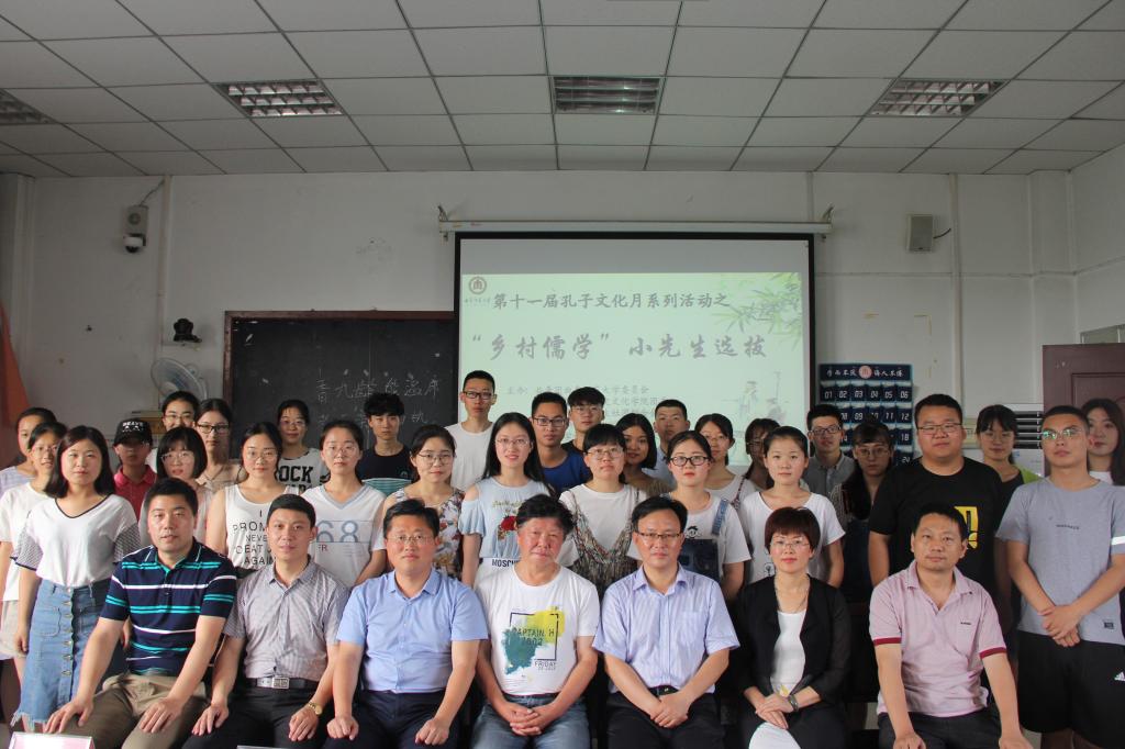 6月2日下午,第十一届孔子文化月系列活动之“乡村儒学”小先生选拔比赛在文史楼520教室圆满落幕。本次比赛邀请了邹城市唐村镇党委书记高胜,曲阜市百姓儒学发起人曲阜市十佳儒学讲师孔为峰,我校兼职教授、孔学专家梅庆吉,曲阜六艺国学院副院长高华,曲阜儒学新苑主任金厚腾,工口动漫 副院长吕厚轩、中国古代史教研室主任刘伟、团委书记王建阳等老师担任评委。