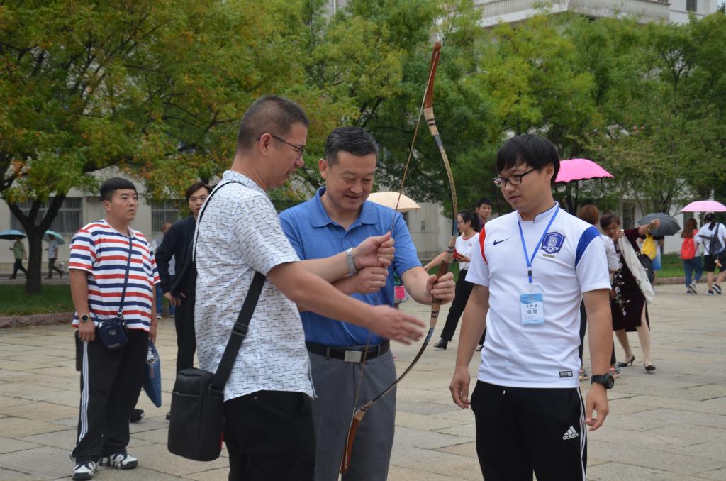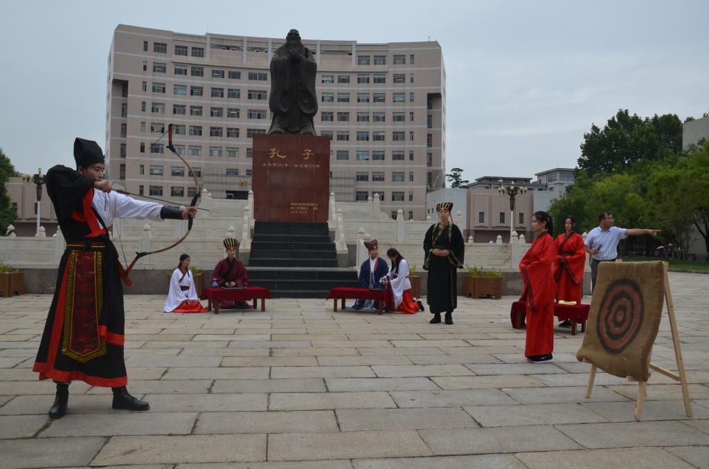 9月28日下午,工口动漫 大学生传统礼仪研修中心为参加山东省传统文化教师培训的老师进行了传统礼仪之射礼展演,展演在孔子文化广场举行,由团委书记王建阳主讲,参与山东省传统文化教师培训的老师们观看并参与了本次活动。