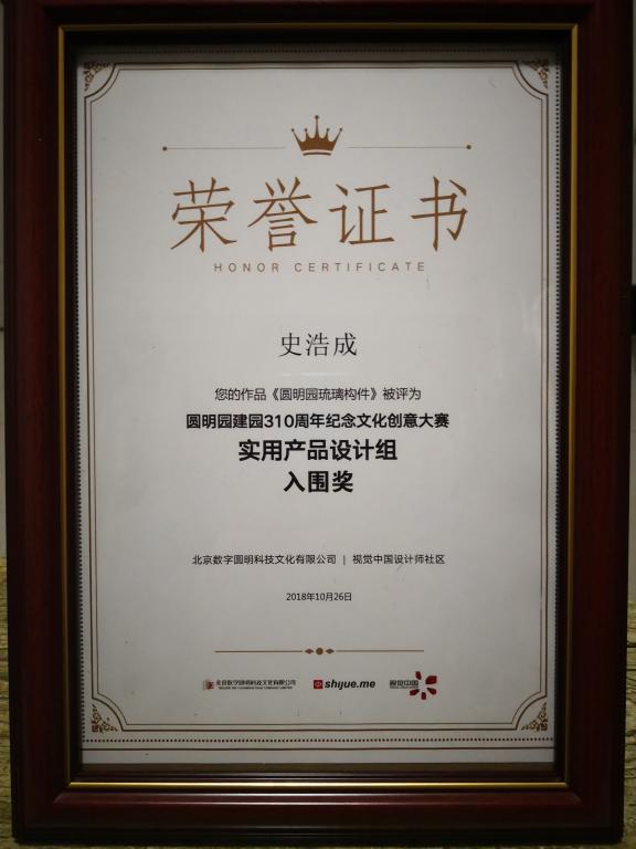 圆明园建园310周年纪念文化创意大赛自今年7月正式启动以来,国内各地人士积极参加比赛,参赛作品达数百件。最终,共有21个作品入围获奖。经过激烈的竞争角逐,史浩成设计的“镜花水影˙流光岁月——圆明园琉璃构件文创系列”作品以优秀成绩脱颖而出,最终获得实用产品设计组入围奖的优秀成绩。