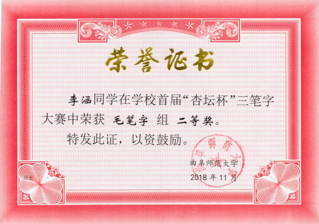 李涵 毛笔字组二等奖