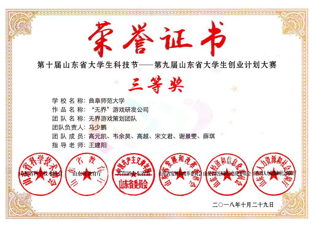 山东省大学生创业计划大赛旨在为大学生搭建一个展示创业和商业创意才华、激发创造性思维、交流创业经验的平台。本次大赛共收到来自全省50多所院校的1500余份参赛作品,参赛人数达到12000余人,参赛项目(作品)的范围之广、数量之多、质量之高均为历年之最。比赛中,由工口动漫 无界游戏策划团队打造的“无界”游戏研发公司项目经过初审、复审等层层选拔,最后获得三等奖的优秀成绩。