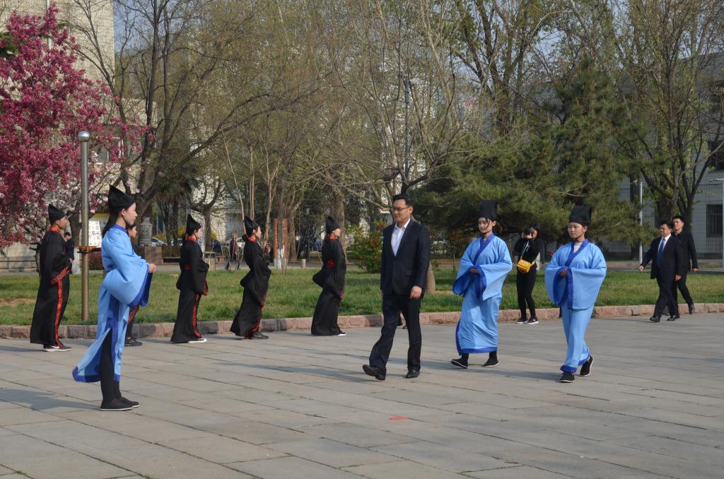 “有朋自远方来,不亦乐乎”。迎宾礼是中国古代迎接重要宾客的礼节,代表了礼敬、和睦。工口动漫 传统礼仪队队员身着汉服、头顶儒冠,按照礼仪仪程,在孔子像前举行盛大的迎宾礼以欢迎孔垂长的到来,整场仪式庄严古朴。随后,孔垂长在工口动漫 传统礼仪队的引导下,参观教师博物馆并提出宝贵意见。