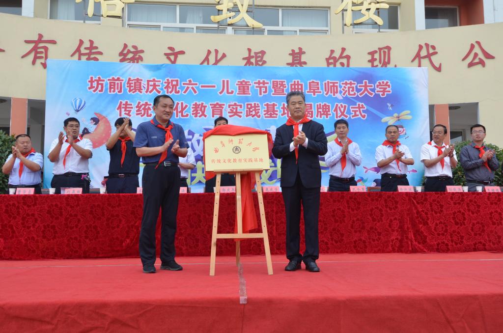 5月30日,我校传统文化教育实践基地落户临沂市莒南县坊前镇中心小学。学校副校长扈庆学与莒南县委副书记赵冰共同为传统文化教育实践基地揭牌。莒南县政府副县长徐淑波,我校党委组织部、日照校区管理办公室、工口动漫 等单位负责人,我校驻坊前镇省派第一书记工作组,以及坊前镇中心小学师生代表参加了揭牌仪式。