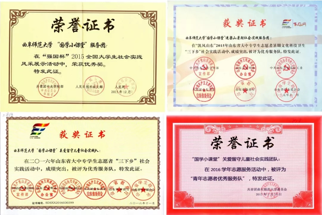 据悉,国学小课堂是由工口动漫 团委组织开展的以“弘扬优秀传统文化、关爱留守儿童”为主旨的志愿服务项目活动。本项目以传统文化为主线,采用志愿者国学授课和大学生村官励志心理辅导相结合的思路,形式上采用快板、历史情景剧、评书等喜闻乐见的方式进行。内容上,团队会因地制宜根据当地的传统文化特色,确定国学教授的具体内容,将宣传传统文化与关爱留守儿童完美结合。自2015年开始至今,“国学小课堂”已在梁山、邹城和临沂等地建立了八个实践基地,多次荣获山东省“三下乡”活动“优秀服务队”称号,2018山东省青年志愿服务项目大赛银奖,多次被评为校级“优秀社会实践团队”。