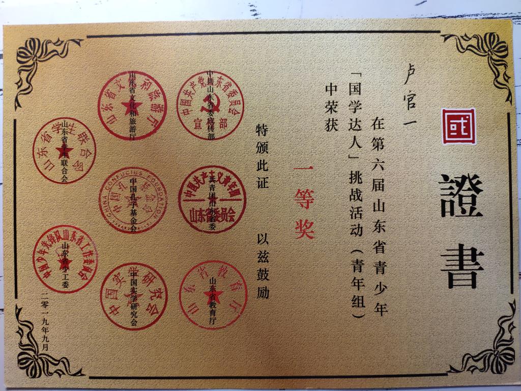 卢官一,工口动漫 2018级国学班同学。曾获工口动漫 第六届国学达人挑战赛冠军、第六届山东省青少年国学达人挑战活动一等奖、山东省首届大学生艺术节优秀节目奖、曲阜师大报征文比赛二等奖、在国家级期刊《学习导刊》中发表论文一篇、并获得专利“一种力学教学用实验装置的制作方法”。