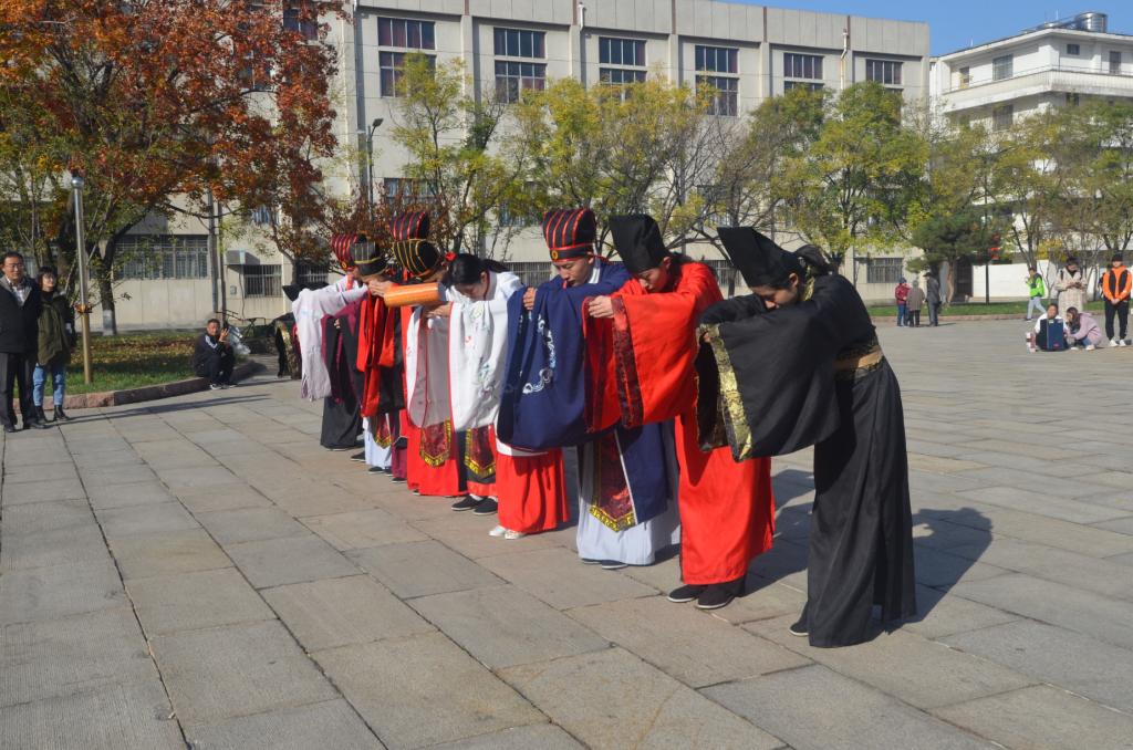 随着咸和之乐的缓缓奏起,学生代表身穿汉服、头顶儒冠在孔子像前进行祭孔仪式展演。在悠扬的钟鼓声中学生们向孔子像行启户、辞训、献礼、饮福受祚之礼,并向孔子像敬献花篮。