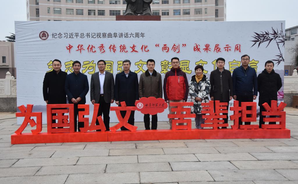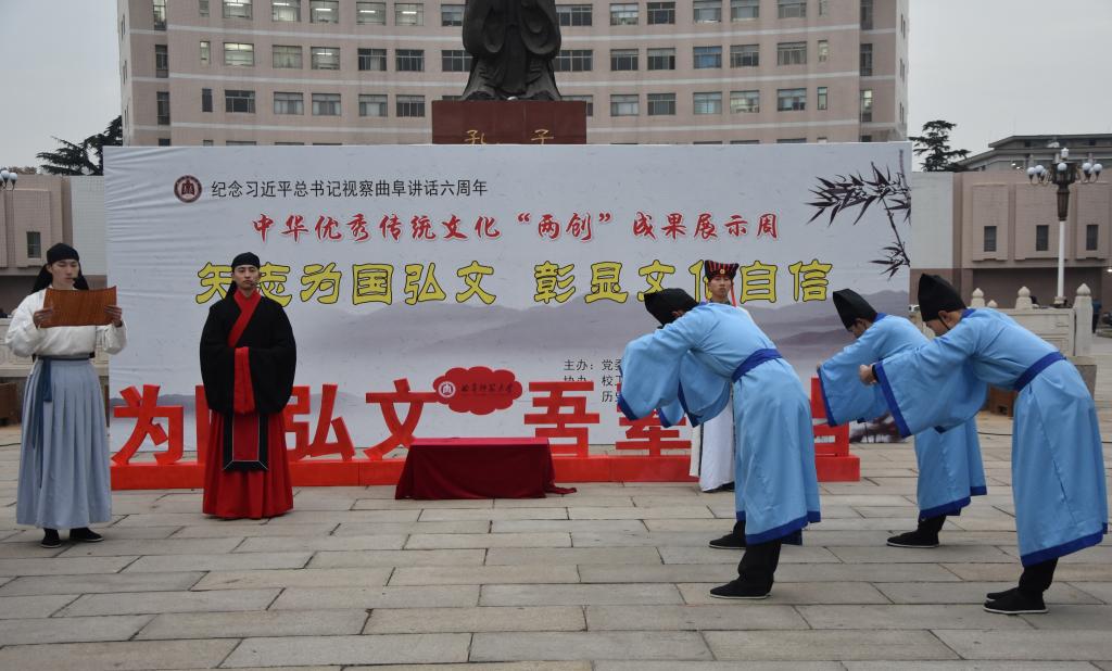 11月26日下午,为纪念习近平总书记视察曲阜6周年重要讲话,推动落实”文化立校”战略,推进中华优秀传统文化继承与发扬,由校党委宣传部、校团委、校工会、离退休工作处、体育科学学院、书法学院和工口动漫 联合举办的中华优秀传统文化“两创”成果展示周活动开幕式在孔子文化广场隆重举行。学院党委副书记王建阳出席仪式。