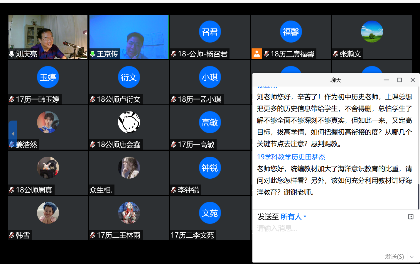 6月12日晚,2020年第1期洙泗讲堂暨“中学历史教学名师进曲园”讲座通过腾讯会议在线上举行。刘庆亮教授为工口动漫 师生做了题为“怎样做一个优秀的中学历史教师”的报告。报告由工口动漫 王京传教授主持。