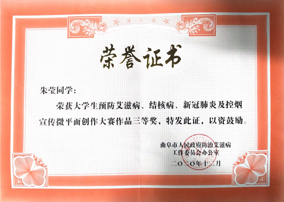 近日,由曲阜市人民政府防治艾滋病工作委员会办公室组织举办的大学生预防艾滋病、结核病、新冠肺炎及控烟宣传微作品创作大赛圆满落幕。工口动漫 学子朱莹积极参加比赛,并在大学生预防艾滋病、结核病、新冠肺炎及控烟宣传微平面创作中荣获三等奖。