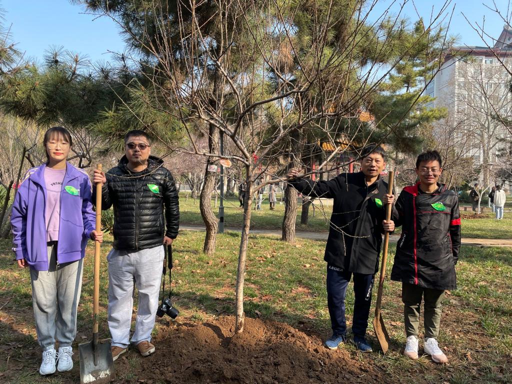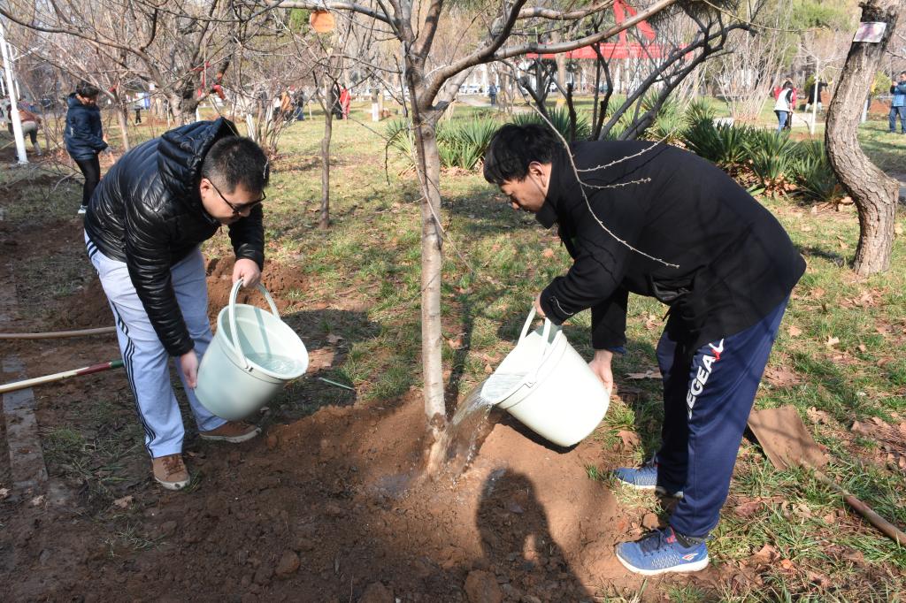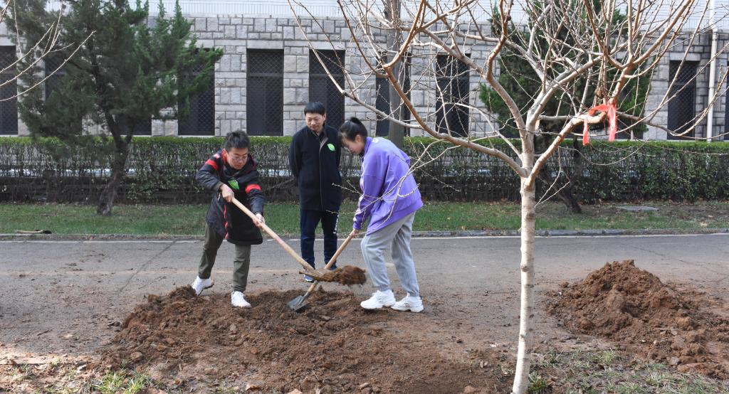 当天上午9点,参加植树活动的教师代表刘伟老师、续大鹏老师和学生代表江彤菲同学、徐润泽同学,在工作人员带领下领取树苗后,立即在桃李园开始植树活动。师生分工明确,相互配合,共同植树。树苗栽种完毕后,老师与同学们共同挂上了象征工口动漫 的标识牌。