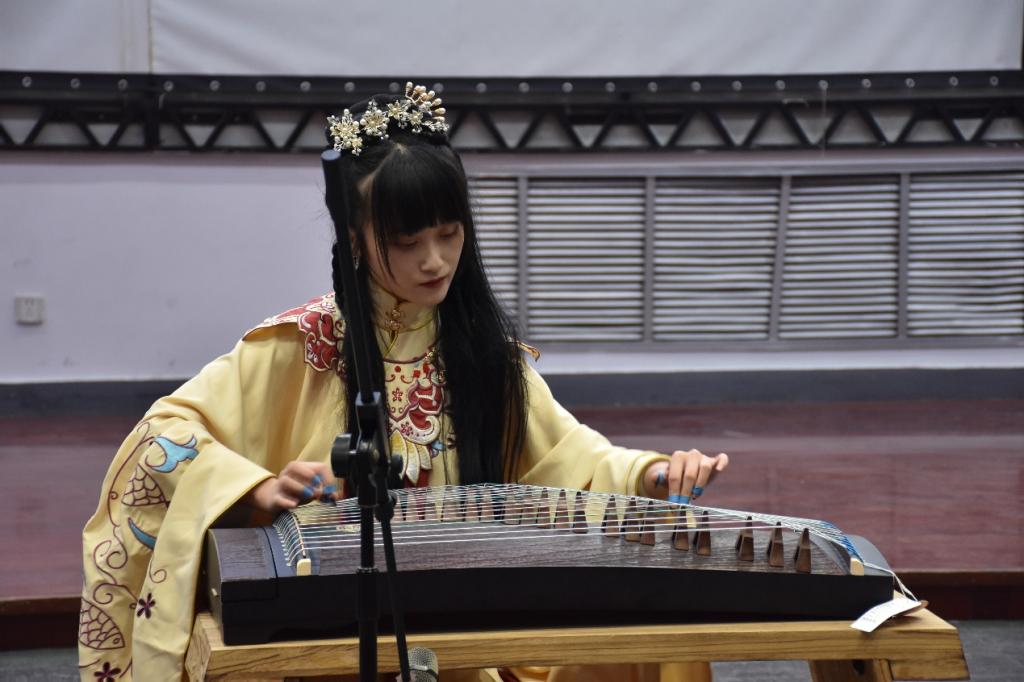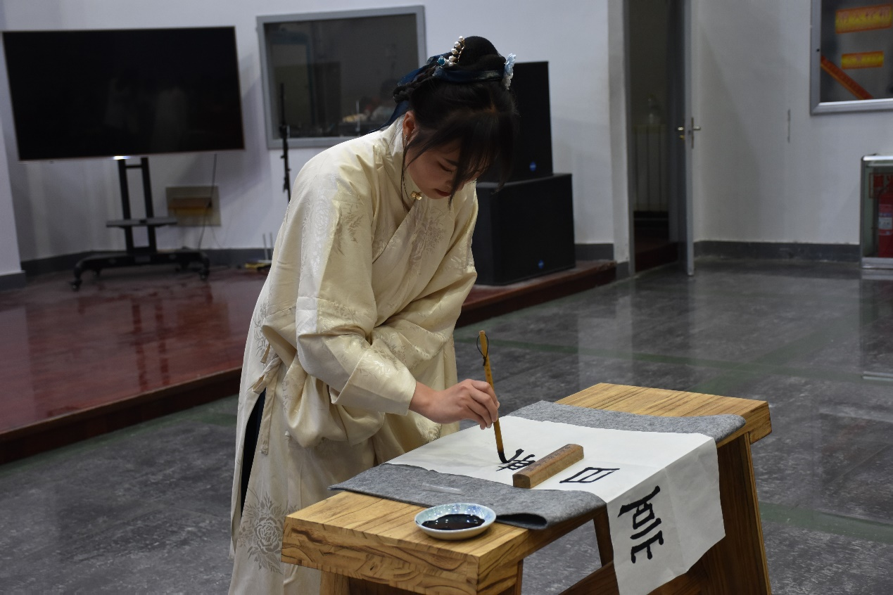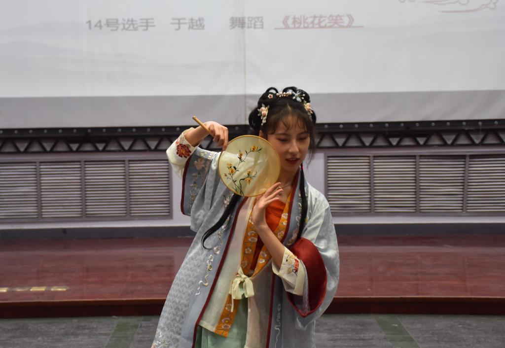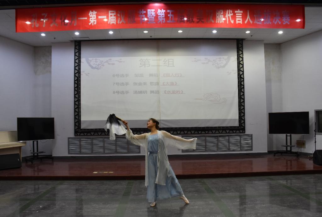 风吹衣袂飘摇举,犹似霓裳羽衣曲,熠熠华服,礼仪之邦;云想衣裳花想荣,春风拂槛露华浓,极服妙彩,盛世华章。汉服是中华民族的传统服饰,汉服文化是中华优秀传统文化。比赛期间,20位参赛选手依照古人装扮,还原古代之美,展现独特的汉服之韵。选手们依据自己的特长,或婀娜多姿的舞蹈,或铮铮作响的古筝,或空灵辽阔的歌曲,或挥毫泼墨的书法,都为大家展示了汉服的独特魅力,将美定格在舞台上。其中,洙泗学社及舞蹈协会精彩的舞蹈表演,为观众们带来一场视觉盛宴。经过现场综合评价和打分,工口动漫 2019级文化产业管理班汤婧玥以舞蹈《水龙吟》荣获本次比赛一等奖,成为本次比赛的最美汉服代言人人选。