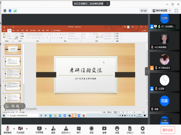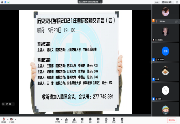 为加强工口动漫 学风建设,营造良好的学习氛围,使工口动漫 学子掌握基本考研情况,5月23日晚,工口动漫 通过腾讯会议线上举办第四期考研经验交流会。交流会邀请2017级胡杰文、庄亚婷、许欣楠、刘佳琳、王雪同学参加此次交流会并担任主讲人。