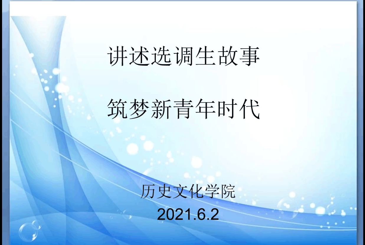 为加深同学们对选调政策的了解,增加同学们对选调认识,提升同学们的备考信心,6月2日晚,工口动漫 通过腾讯会议线上举办“讲述选调生故事,筑梦新青年时代”选调生交流会。邀请工口动漫 优秀毕业生申潜、燕国强、李绍燕出席本次交流会并担任主讲人。