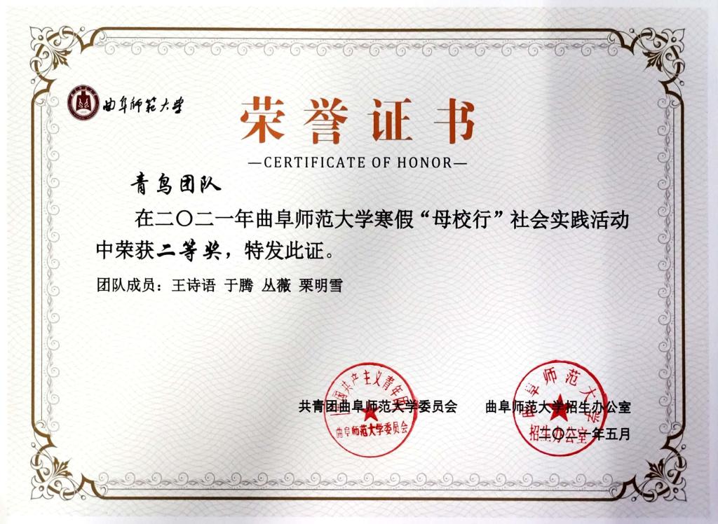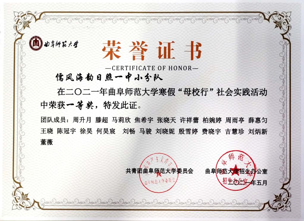 近日,“青鸟计划”主题实践活动与寒假“母校行”社会实践活动评选结束。工口动漫 学子在活动中取得佳绩。“青鸟计划”主题实践活动中,胡纪新、胡梦潭、柴皓鸽等18名同学被评为“优秀学子”。 寒假“母校行”社会实践活动中,儒风海韵日照一中小分队荣获一等奖,青鸟团队、属你唯“一”队荣获二等奖。