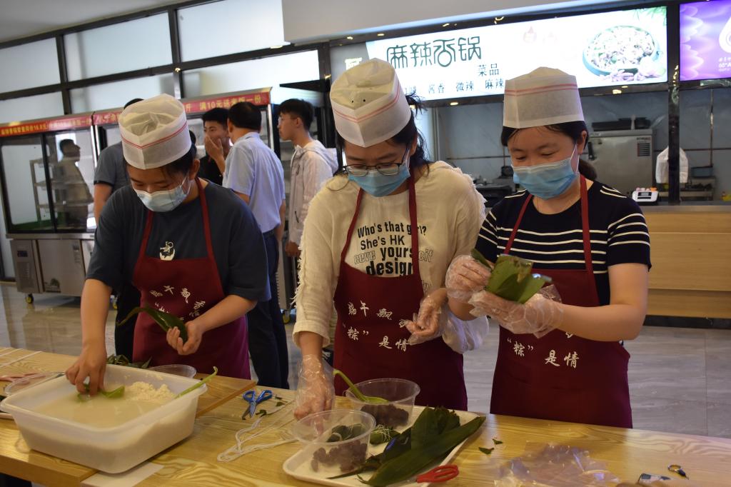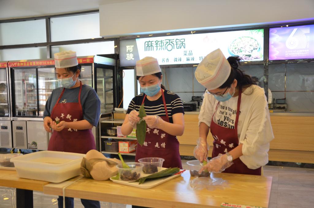正值建党一百周年之际,为表达对民族先人和革命先烈的怀念和追思,传承优秀传统文化,6月11日下午,由校工会主办,后勤工会、后勤管理处生活服务中心承办的“又到端午节,又闻粽飘香”活动于三餐二楼举办。工口动漫 王静老师、李贝老师、徐银雪同学参加活动。 活动分为两部分,首先邀请了有经验的厨师教授包粽子的方法,她从粽叶的摆放、加米、添加心、折叠粽叶到包扎粽子等一一进行讲解,王静老师、李贝老师和徐银雪同学进行了认真的学习。其次,进行了包粽子竞赛,王静老师、李贝老师和徐银雪同学在激烈的比赛中顺利的包完了10个粽子,完成了比赛。 通过本次活动,师生们掌握了包粽子的方法,增强了师生们民族认同感和民族自豪感,传承了中华优秀传统文化,使师生们在活动中感悟到“真理的味道”。