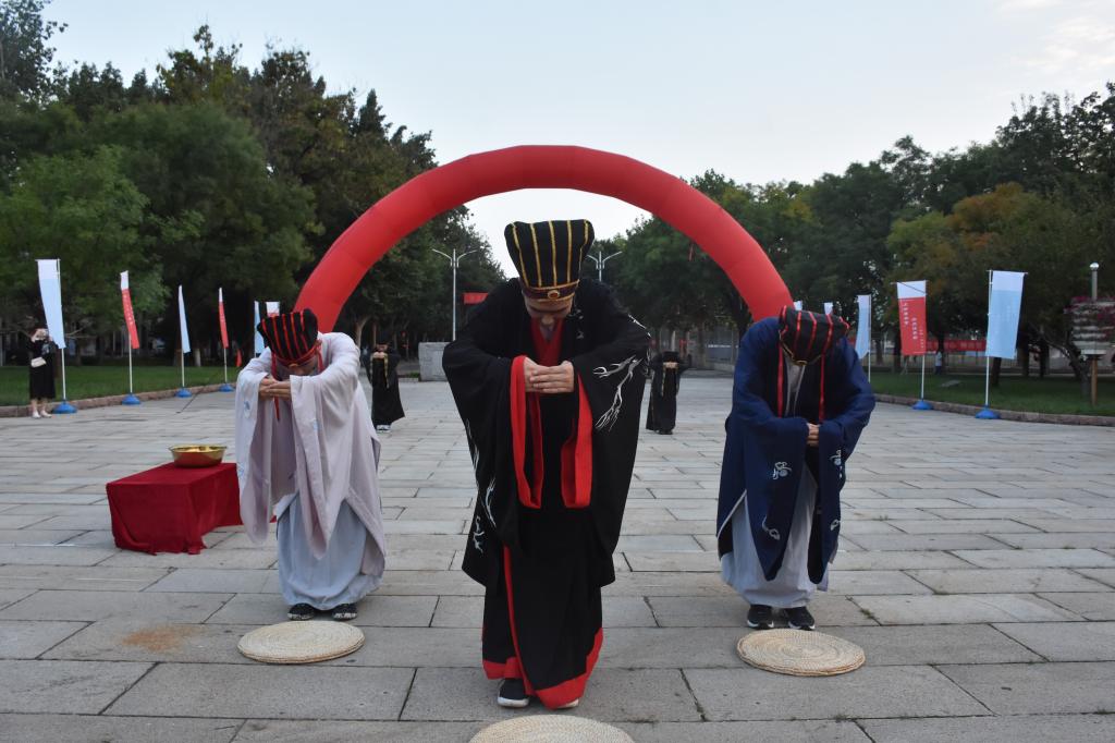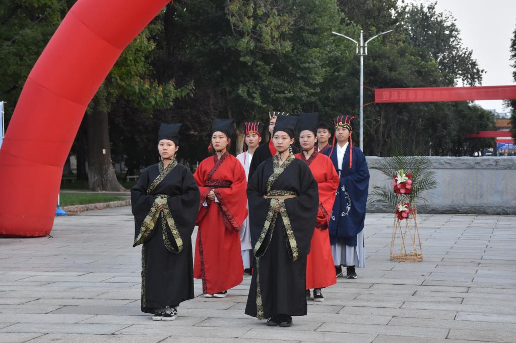为迎接第37个教师节的到来,弘扬尊师重道传统,9月10日下午,工口动漫 大学生传统礼仪研修中心于孔子文化广场进行传统礼仪“释菜礼”展演。 随着弦和之乐缓缓奏起,传统礼仪队队员身着汉服、头戴儒冠,进行释菜礼仪式的展演,在悠扬的钟鼓声中向孔子像行启户、辞训、献礼、饮福受胙之礼。 整场仪式庄严、古朴,礼仪队队员心怀敬意,礼仪有节、行止有度、揖让有法,在独特的儒家风韵中,以彬彬古礼谢师恩、表敬意,展现出尊师明道的深厚文化底蕴。