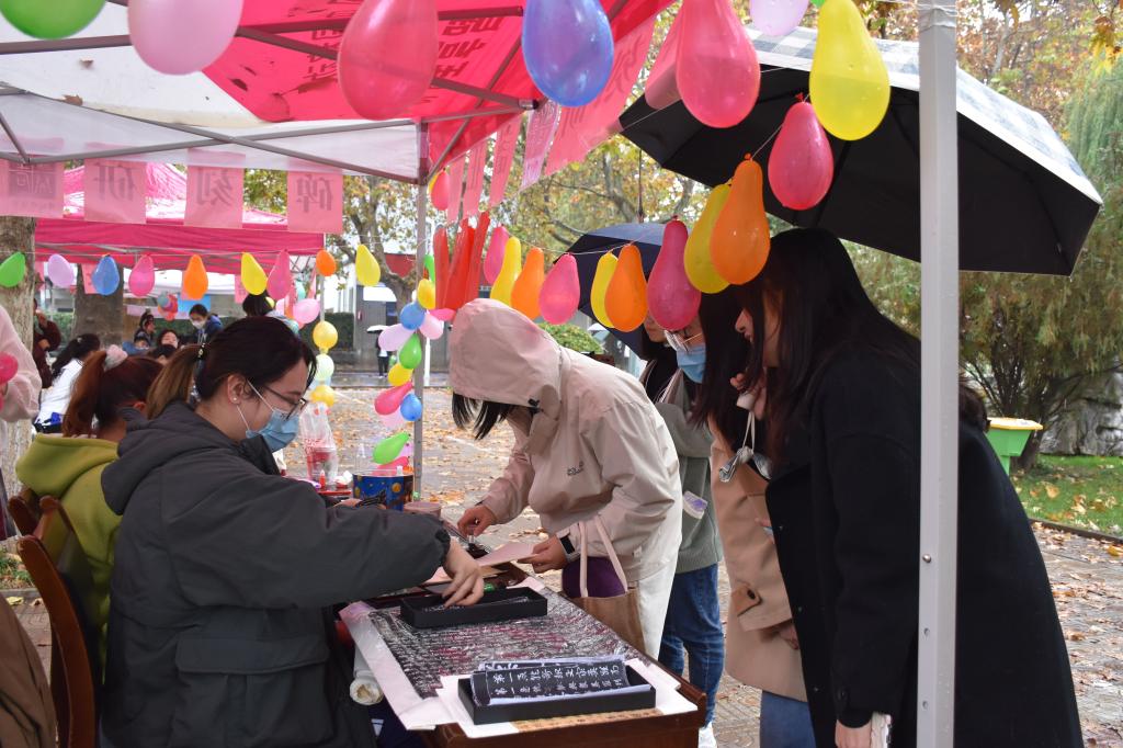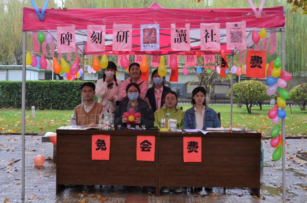 为响应学校防疫要求,以学院为单位进行社团纳新,11月6日,工口动漫 洙泗学社、《论语》研修学社、史苑学社、文博学社、拾光文化创意社、辩论社、羽毛球协会、碑刻研读社于文史楼前积极进行纳新。