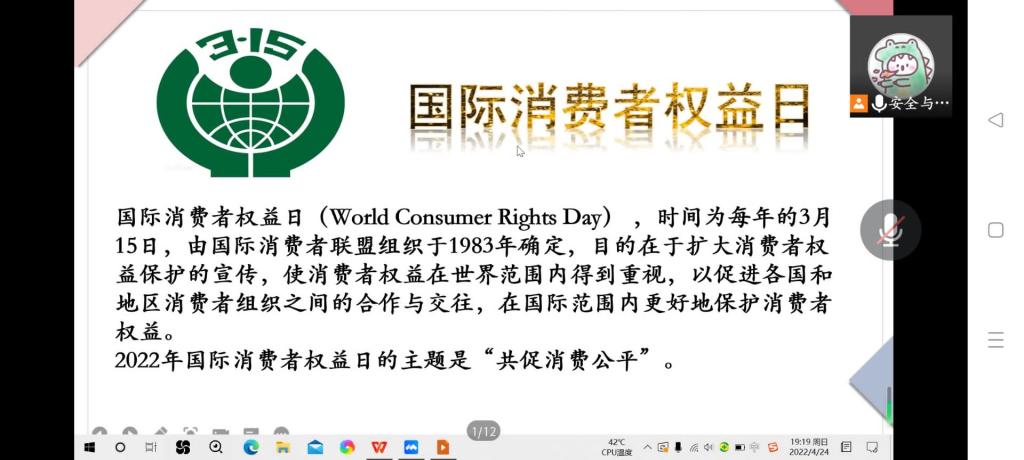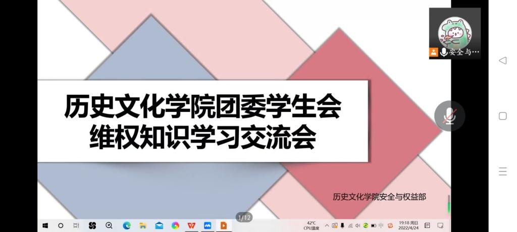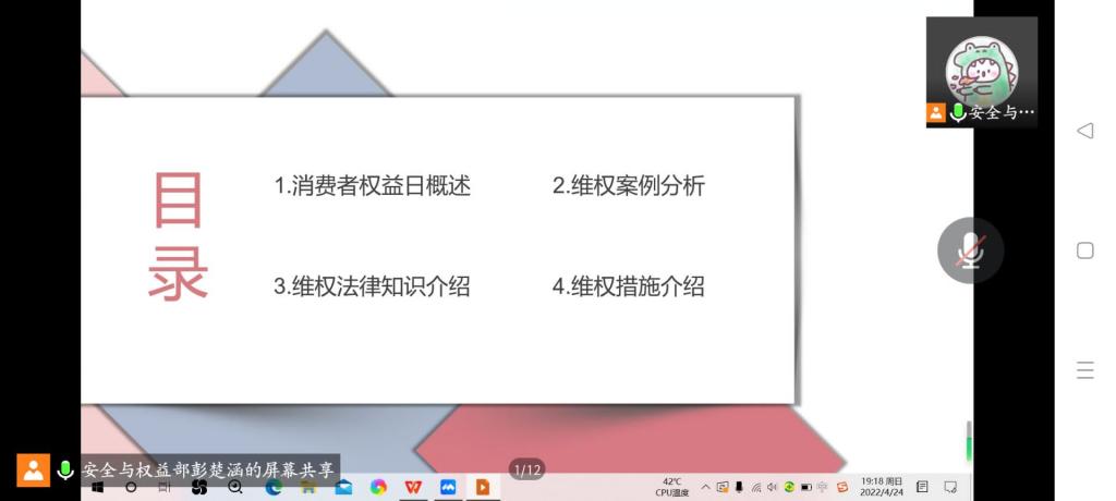 为了培养大学生的维权意识,加强维权知识的学习,4月24日晚上,工口动漫 举行线上学团维权知识学习交流会,宣传维权知识。安全与权益部部长彭楚涵担任主讲人,各班级负责人参加会议。