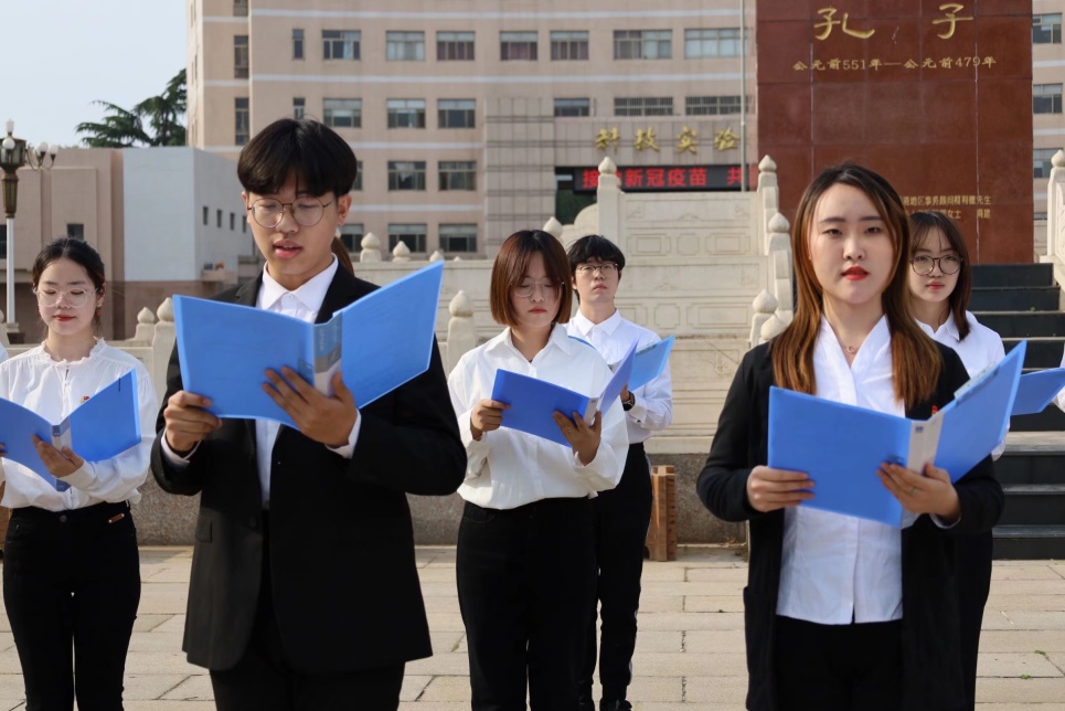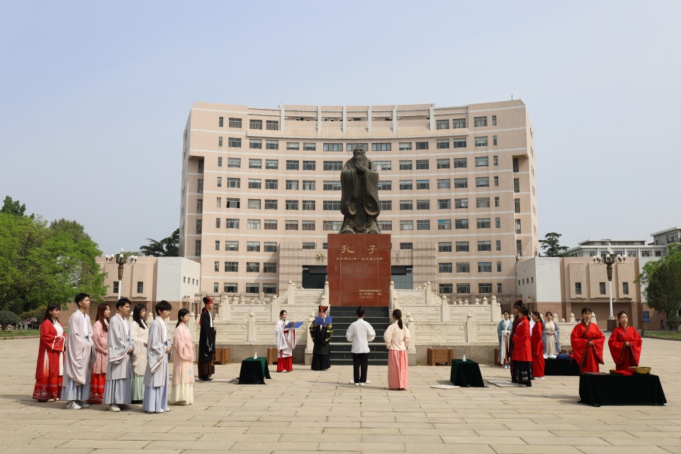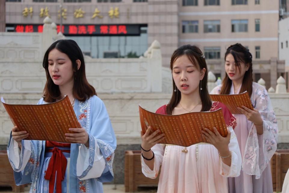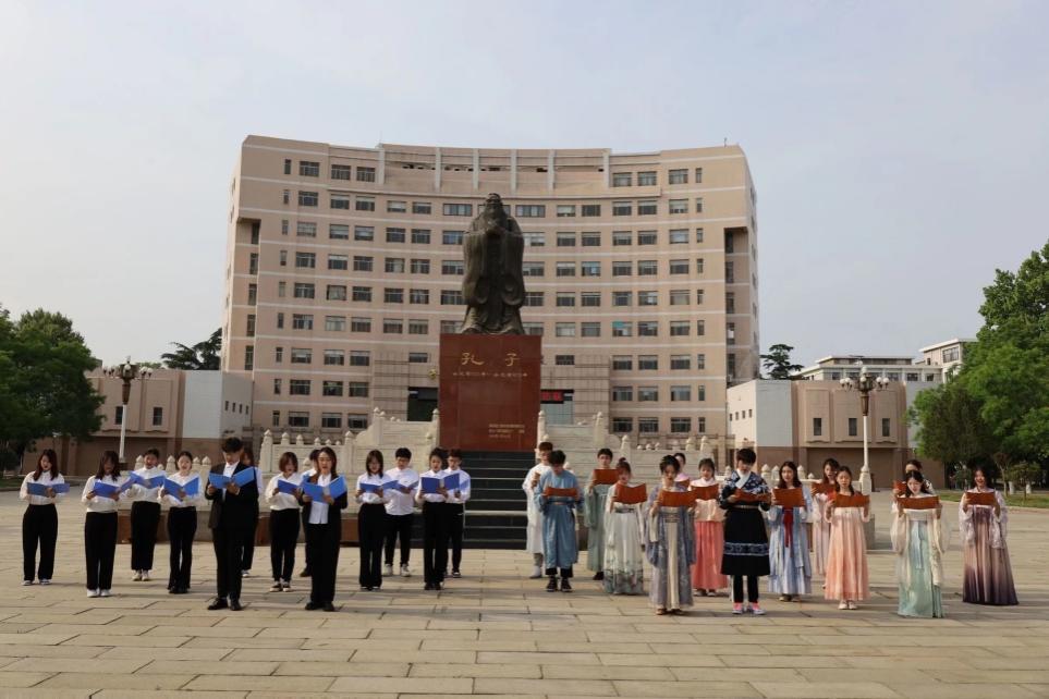 为使同学们蓬勃奋发,展现中华风采,工口动漫 儒马会通社团于孔子文化广场中央举行第三幕展演—— “青衿之志,履践致远”诵读。一侧方队汉家衣裳,中华之美,一侧方队西装革履,庄重严肃,同学们通过古今对话形式的诵读,追忆了党史的发展历程,将儒家传统文化与五四青年精神融合为一体。诵读表演让同学们更清楚地了解到中国古今变化,激励了同学们为中华复兴贡献出自己的一份绵薄之力。