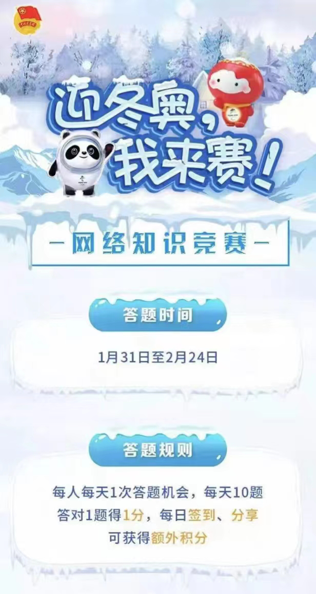 为抓住2022年北京冬奥会契机,进一步落实《关于面向全国大学生团员组织开展“青春爱运动健康强中国”全民健身活动的通知》要求,共青团中央青年发展部、国家体育总局群众体育司、中国青年报社、中国青年网联合推出“迎冬奥,我来赛!”网络知识竞赛活动。1月31日-2月24日期间,工口动漫 积极组织学生参加网络知识答题竞赛。