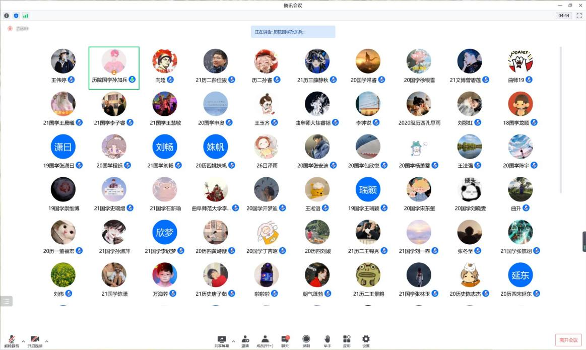 本次活动采取线上会议形式,分为上半场和下半场进行。上半场由张博伦、王凇语、李钟锐、焦睿韬四位同学依次对《清华简六<子仪>篇文本释读及相关史事问题再讨论》、《秦汉简牍“城旦春”考述》、《清代宁波慈城孔庙研究初探》、《乾隆朝的“圣脉”陪护与孔府危机》四篇论文进行分享,刘伟、王法强老师共同进行了点评,在论文写作过程中的文字表达、文献引用等规范性问题上提出了建议;下半场由卢官一、袁子阳、李艾嘉、龙顺、李天洋五位同学依次对《公私之间:清末商人参与防疫事业研究》、《邦交别径:民国北京政府对日赠勋案研究》、《<妇女杂志>主编风格转变与性别意识的觉醒(1915-1931)》、《“苏修”的诞生:文化冷战视野下的苏联形象建构——以<人民日报>为例(1960-1969)》、《中西方主流媒体对学生新左派运动的报道与目分析——以<纽约时报>和<人民日报>为中心》五篇论文进行分享,万海荞、曲升老师对每位同学的文章进行了细致的点评,并对概念、结构等问题提出修改意见。论文分享结束后,同学们进行交流环节,在场同学提出问题并展开了热烈的讨论,最后由老师们答疑解惑。