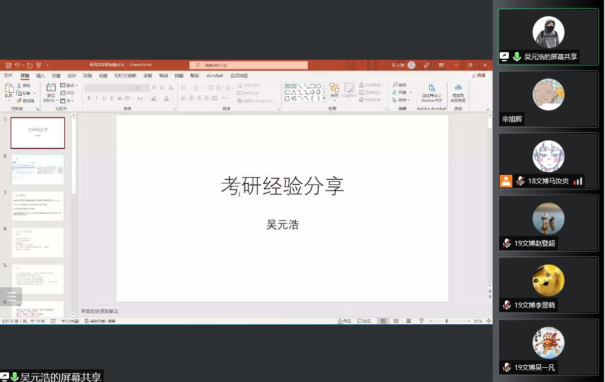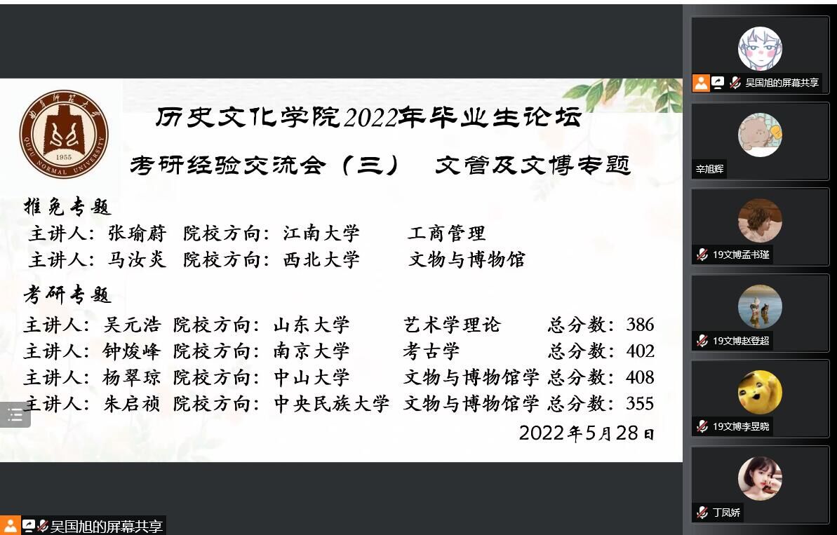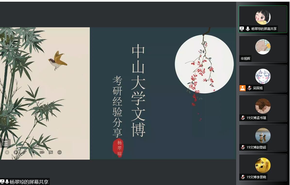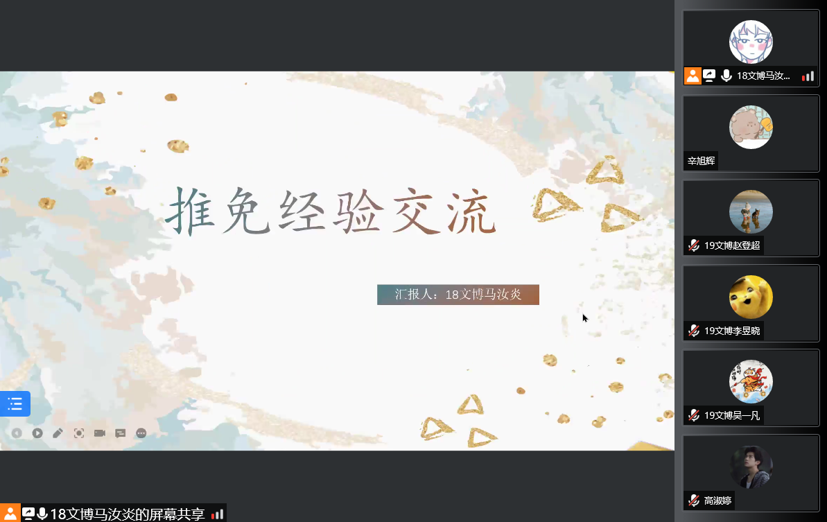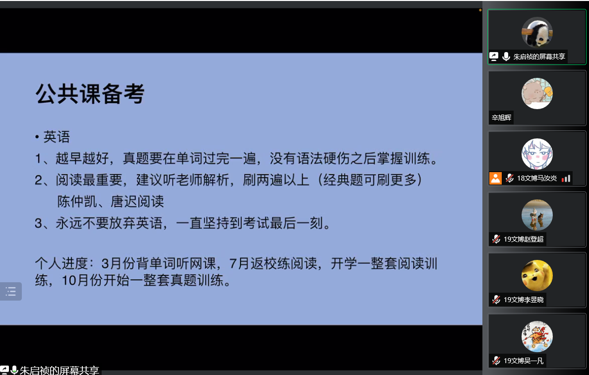 为帮助工口动漫 学子了解推免、考研形势,掌握相关考研技巧,增强工口动漫 学子考研信心,5月29日晚,工口动漫 于腾讯会议线上举办第三期考研经验交流会——文管及文博专题。交流会邀请2018级杨翠琼、张瑜蔚、吴元浩、钟焌峰、马汝炎、朱启祯六名同学参加并担任主讲人,会议由2018级王晗同学主持。