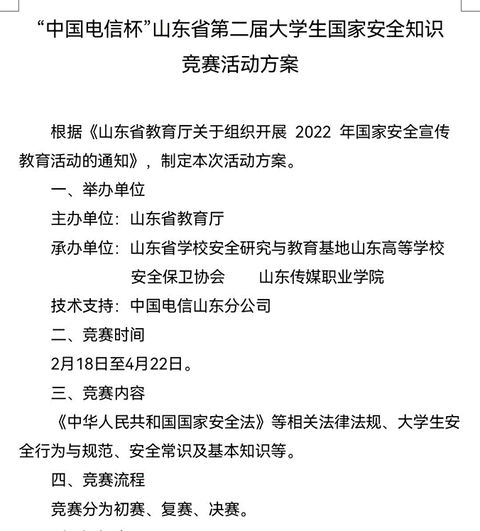 国家安全是安邦定国的重要基石,维护国家安全是全国各族人民根本利益所在。为贯彻党和国家的教育路线,加强大学生安全教育,提高安全意识,山东省教育厅举办“中国电信杯”山东省第二届大学生国家安全知识竞赛活动,活动以线上方式举办,工口动漫 学子积极参与本次竞赛活动。
