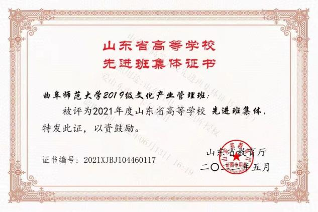 近日,2021年度山东省高等学校先进班集体评选活动落下帷幕。经过申报、评审等层层筛选,工口动漫 2019级文化产业管理班被评为“2021年度山东省高等学校先进班集体”。