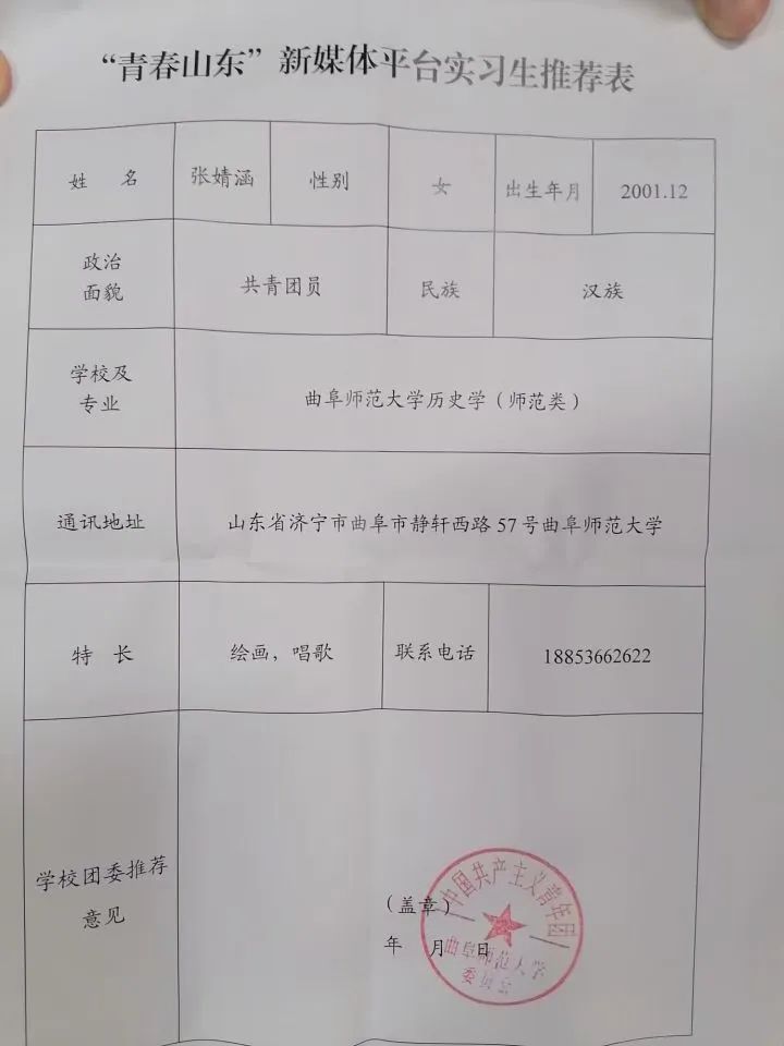 张婧涵同学刻苦努力、勤勉实干,在“青春山东”新媒体平台的工作中取得了优异成绩,下图为张婧涵同学实习证明。