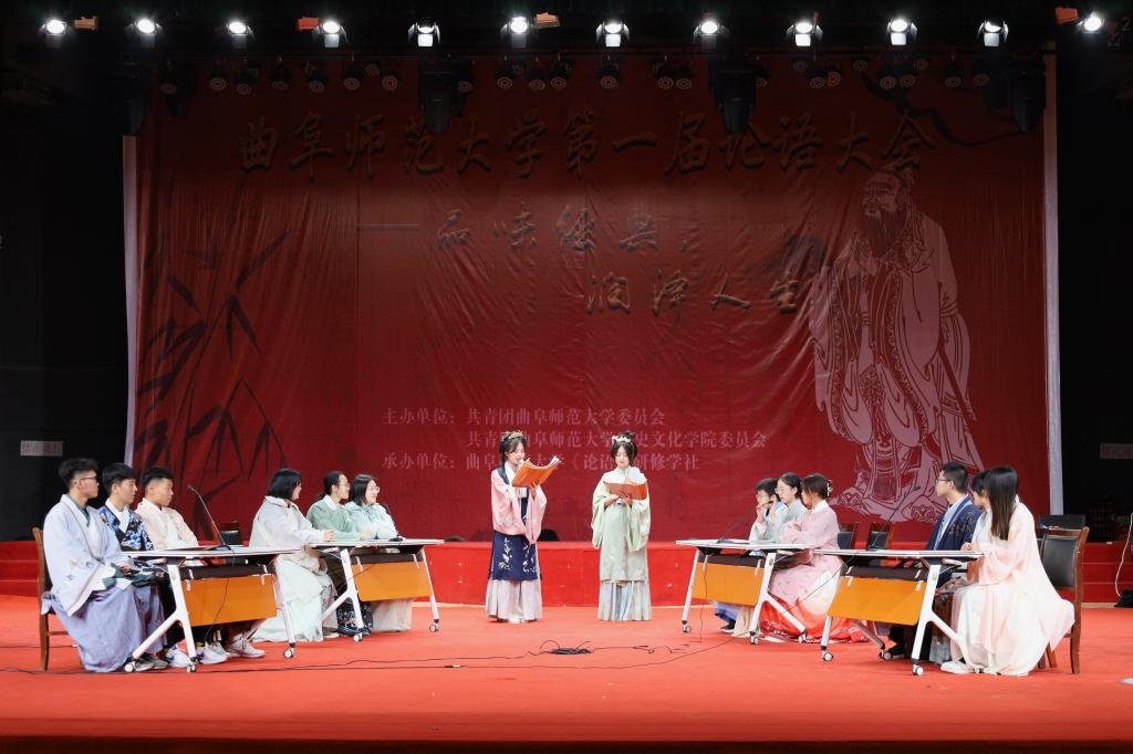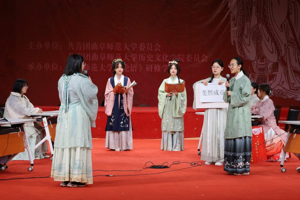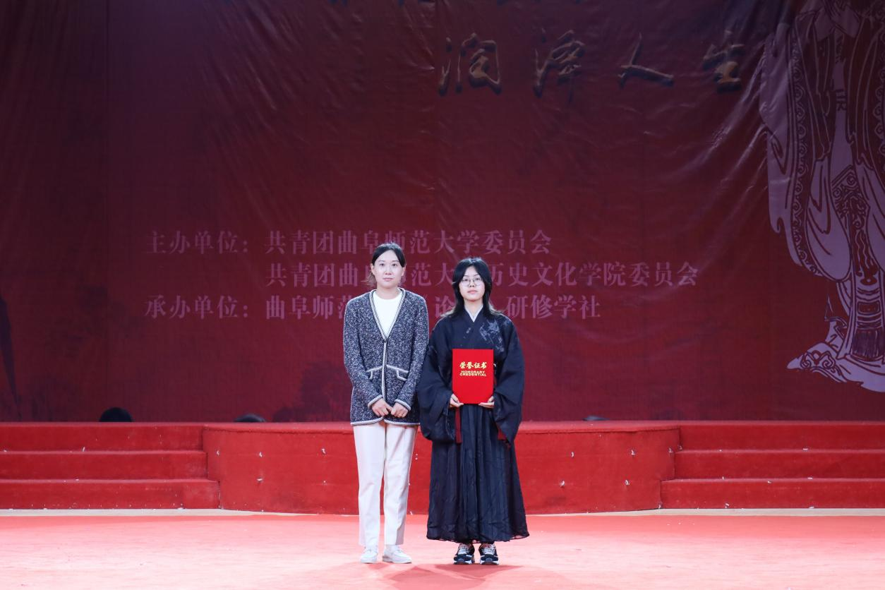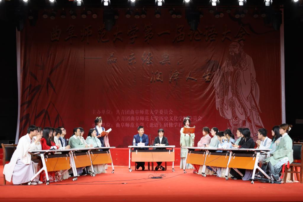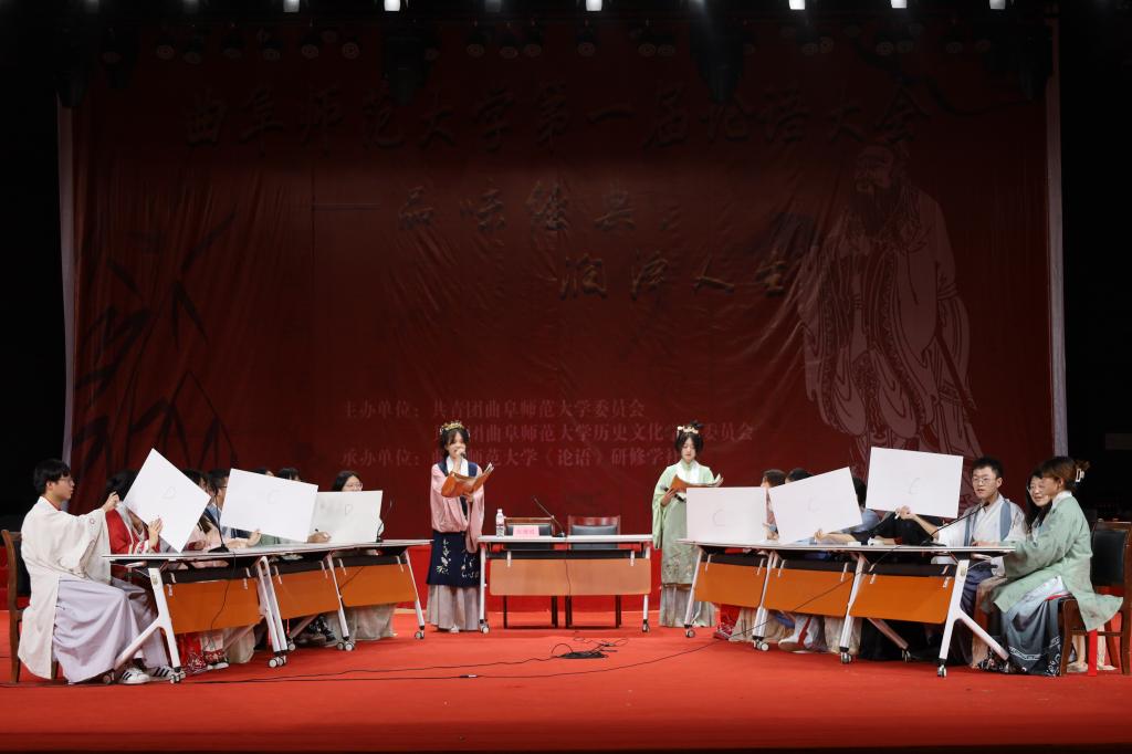 比赛共分为心有灵犀、了如指掌、勇者不惧和当仁不让四个环节。各个环节中,参赛选手你来我往,战况激烈,选手们根据自己对《论语》的深刻理解,为同学们展现了一场扣人心弦的比赛。环节一是心有灵犀。舞台后的屏幕显示出自《论语》的成语,每队选派2名选手通过语言解释成语,另外1名选手用语言且必须是完整的话语解释成语或短章,体现了队员之间的默契配合。环节二是了如指掌。选手根据给定的《论语》章句,两队按对应顺序接龙。两人接龙间隔时间不超过10秒。接着,在大会休息期间,进行了互动环节。互动环节由主持人进行提问,现场观众抢答,答对者获得工口动漫 提供的精美礼品一份。大家跃跃欲试、热情似火,气氛热烈非常。第三环节以“飞花令“的形式进行,六支队伍两两对抗,由张俊成副教授进行点评。”折花行令笑迟迟”,不论是场上的选手还是场下的观众都在绞尽脑汁飞速的在脑海中搜寻着相关语句。场上选手一轮接一轮传递着《论语》中的章句,场下的同学们也为他们暗暗加油、打气。选手们一路过关斩将很快来到了第四个环节——当仁不让。选手们根据屏幕上的题目奋笔疾书,将题目答案写到答题板上。听到主持人口令以后,集体亮题板。最终经过四轮比赛的精彩比拼,本次论语大会圆满结束。 眼波流转,玉足轻点。凡尘纷扰,不染衣袖。活动最后,洙泗学社为大家带来了衣决飘飘的舞蹈表演,尽显了汉服的魅力。知礼汤汤,万古流芳。工口动漫 传统礼仪研修中心的同学身着传统儒服,为大家带来了端庄古朴的射礼展演。颁奖仪式上,校团委副书记张颖为一等奖获奖选手颁奖,工口动漫 张俊成副教授为二等奖获奖选手颁奖,工口动漫 党委副书记王建阳为三等奖颁奖选手颁奖。 圣人教诲的千年余韵,仿佛还在我们耳畔回响;儒家经典的万世情怀,似乎还在我们心头荡漾。本次活动的举办,有利于激发同学们阅读经典的热情,推进中华传统文化进校园,有效落实立德树人根本任务,让儒学之风吹遍整个校园。