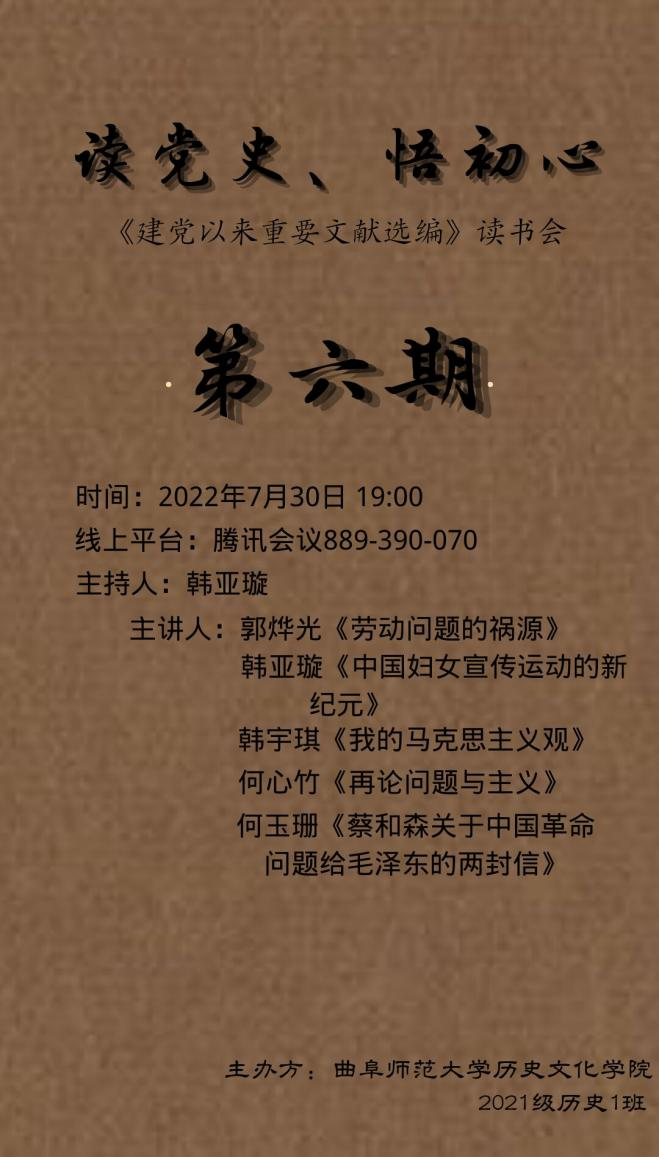 为充分认识劳动问题以及妇女解放运动的重大意义,认真了解劳动问题的祸源,全面准确把握妇女运动的时代意义以及现实影响,工口动漫 于7月30日晚举办读党史、悟初心读书会。本次读书会由张世慧老师指导,韩亚璇同学主持。