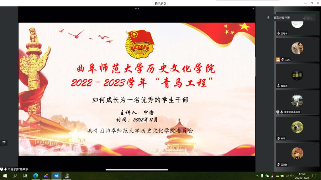 为促进新时代“青马”人对自身责任的认识,11月25日,工口动漫 开展了以“七年‘青马’经历谈新时代‘青马’人”为主题的线上青马工程讲座。本次会议特邀工口动漫 杰出校友申潜担任主讲人,工口动漫 所有青马工程班成员均参加会议。