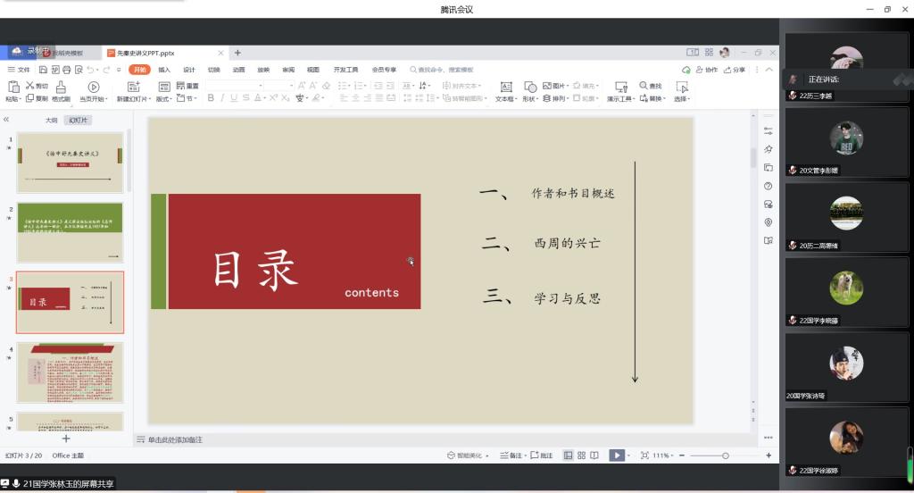 本次读书会通过腾讯会议线上举办,分享人向同学们介绍了相关古籍的作者和书目概述、主要内容以及学习与反思,并组织参会人员进行交流讨论。参会人员积极分享自己的阅读心得,或是即兴演讲,现场气氛热烈。