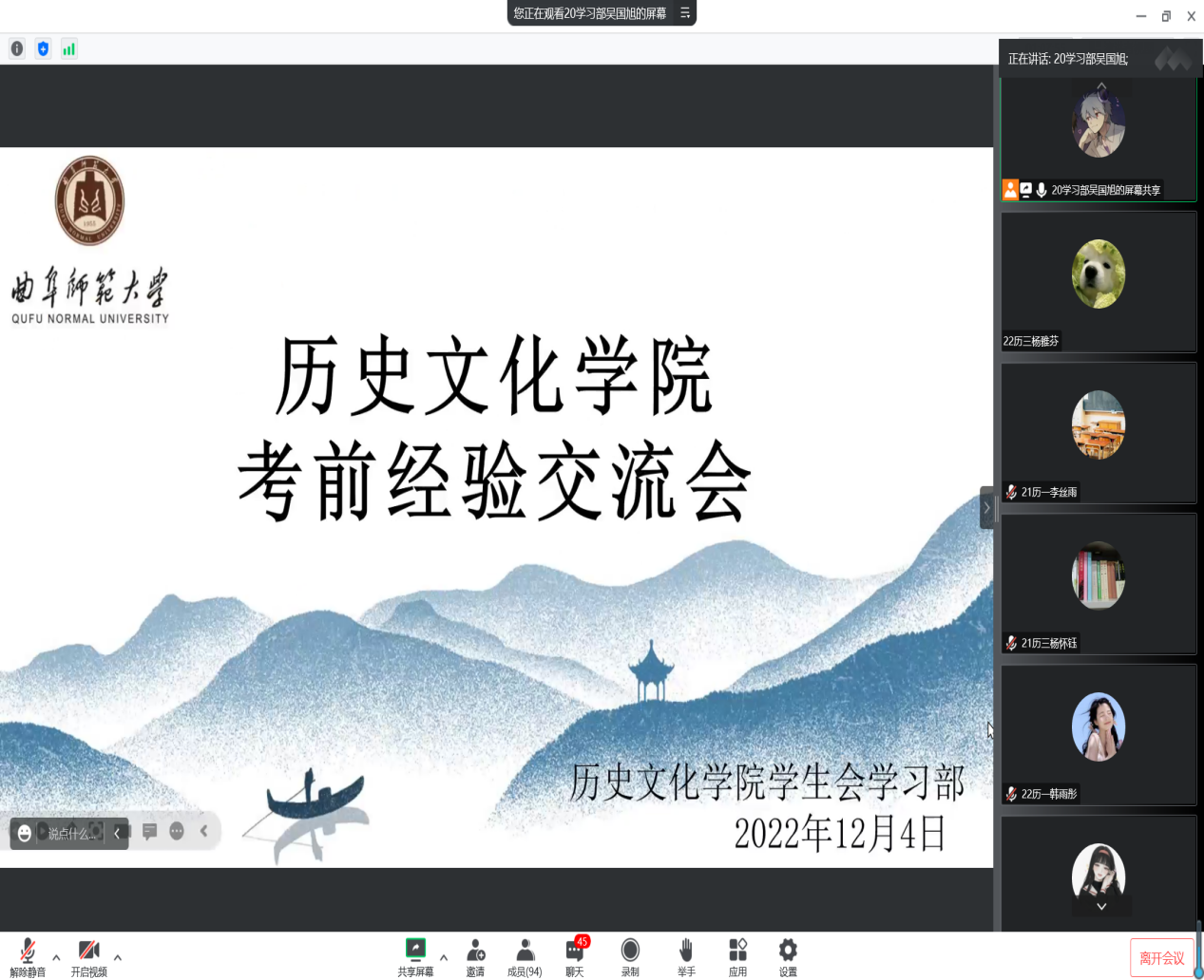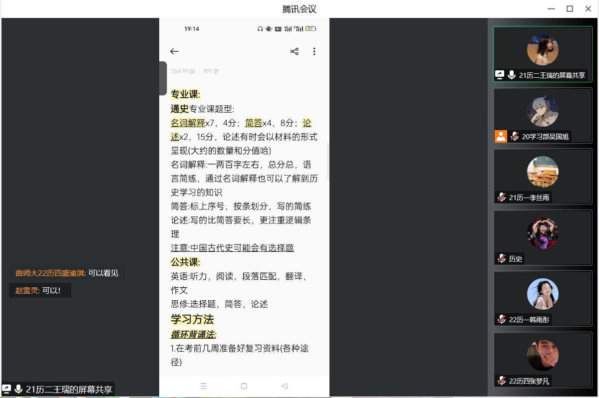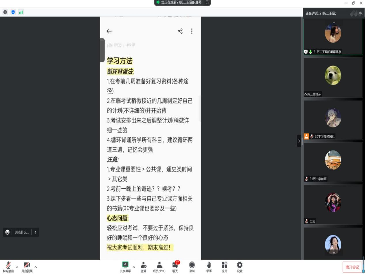 为帮助工口动漫 学子更快适应大学学习生活,加强同学们对考试问题的了解,掌握相关学习技巧,帮助同学们在考试中取得更好成绩,12月4日晚,工口动漫 于腾讯会议线上举办22级考前经验交流会。交流会邀请2021级国学、师范、文博、文管优秀学习代表参加并担任主讲人,分为四个会场,会议由学习部部长及副部主持,向2022级全体同学提供考试经验。