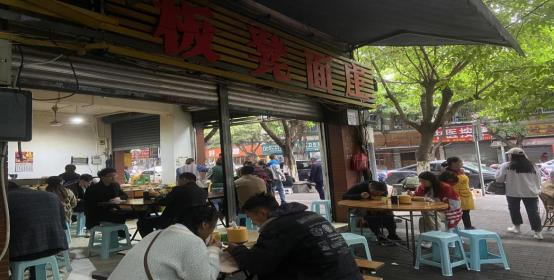 重庆人的一天往往是从一碗小面开始的。1 月 9 日清晨,实践队员便已早早来到了位于 渝北区的“板凳面庄,这并不是一家普通的小面店,在 2014 年,它因其良好的口碑与地道的 面食制作手艺入选了 CCTV 纪录片《嘿,小面》,也因此,里是体验重庆小面最好的地方之一。尽管实践队员在早晨 7 点半就到达了店铺,但此时面庄门前已经是排起长队,服务员们也是在紧锣密鼓地整理清洗已经使用完的餐具,经过一番等待后,实践队员终于吃上了正宗的重庆小面,而第一口下去就让他感叹道麻与辣,而且与其他面食不同的是,重庆小面所使用的面条更细更硬,也因此实践队员也评价到他认为小面品尝起来非常有嚼劲,同时这家店铺还用青菜与煎蛋作为配料,同时辅以浓郁的辣椒香,使得小面整体色香味全,让人食欲满满。