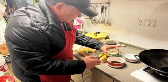 同一天晚,实践队员还在有着丰富小面制作经验的张爷爷的指导下,亲自尝试了制作小 面的各项流程,。首先实践队员先拿出了几根小葱,再将原本细长的小葱小心翼翼地切碎成葱苗,随后,实践队员又拿出了已经准备好的空心菜,这两个食材都是制作重庆小面可选择的辅料。接下来便是配置佐料的环节,这是十分重要的一步,可是面对满目的佐料,毫无经验的实践队员显然有些不知所措。但好在有张 爷爷的帮助,只见爷爷耐心的指导实践队员拿出制作所需要的佐料,一个一个的讲解其作用 与用量,例如味精与鸡精,在张爷爷的建议中,这两样需要多放大约一勺的量,因为这样可以最大程度凸显出小面的口味,实践队员们一边认真倾听张爷爷的教导一边细致地做手放置相应的佐料,不一会,这碗由葱花、油辣子、猪油等辅料调制而成的底料就在实 践队员与张爷爷共同努力下完成了。