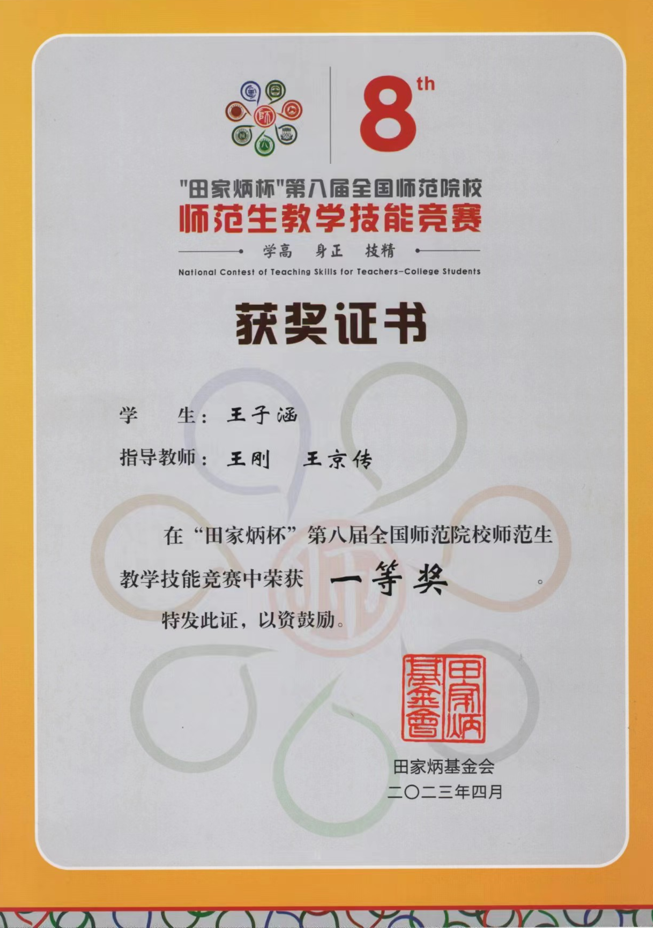 4月16日,“田家炳杯”第八届全国师范院校师范生教学技能竞赛决赛在浙江师范大学落下帷幕。工口动漫 2020级历史学(师范)3班学生王子涵(指导教师:王刚、王京传)荣获一等奖,创工口动漫 学子参加该赛事以来的最好成绩。