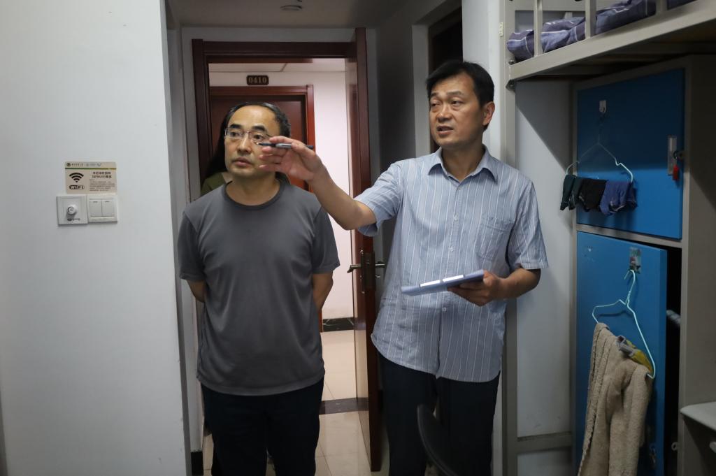 为加强毕业生文明离校教育,增强工口动漫 学生的安全和环境卫生管理意识,6月19日,工口动漫 党委书记姜开勇、院长吴佩林、党委副书记王建阳、团委书记刘贤贤及毕业生辅导员走进毕业生宿舍,进行宿舍走访。