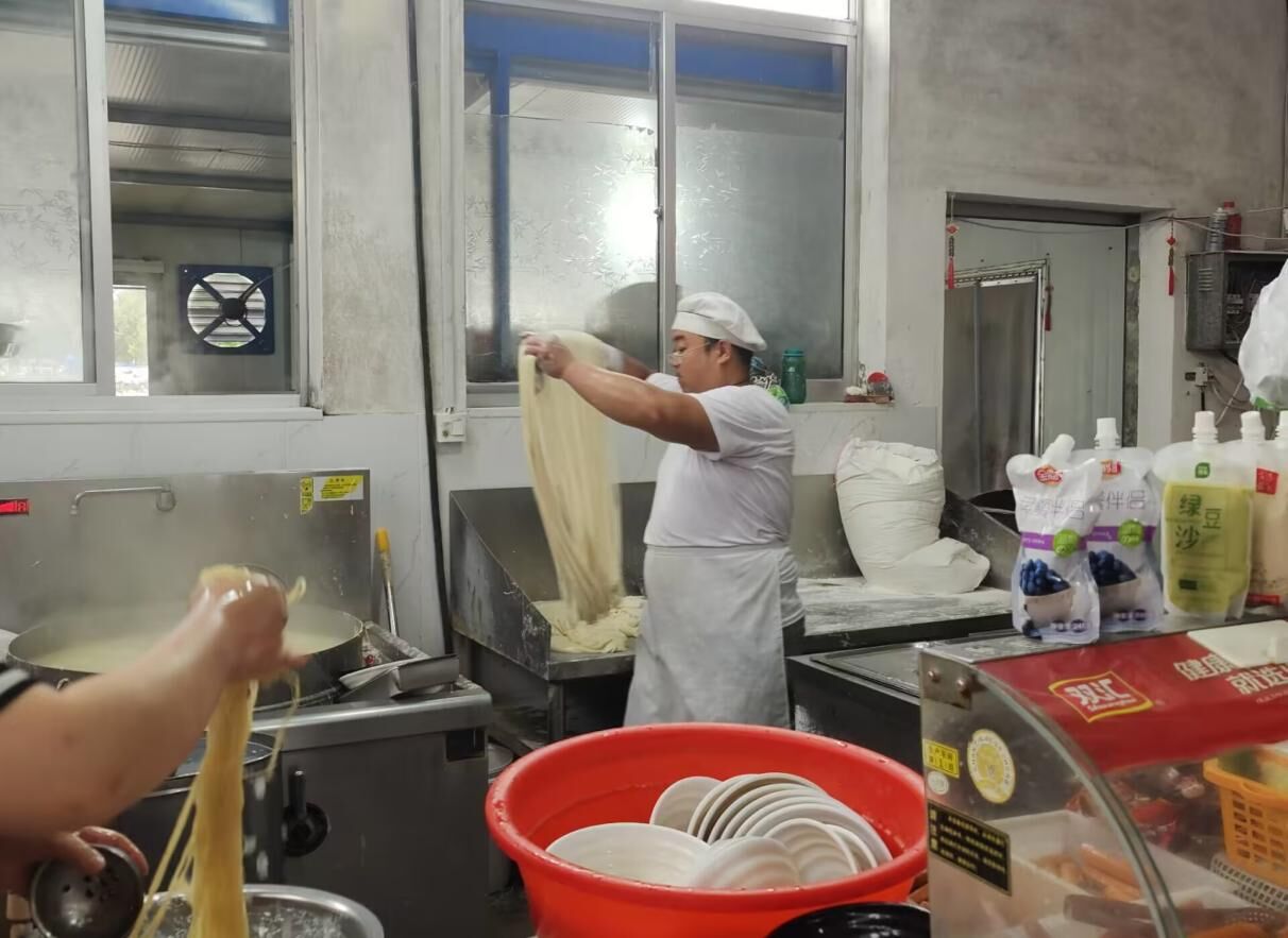 一碗小面的完成过程是赏心悦目的。制作小面的重点之一是小面师傅制作面条,只见师傅穿着白色跨栏背心,露出两条粗壮有力的胳膊,两只手分别拉起面团的两段,使用巧劲将面团拉长,再一对折,反复几次,面条便算是拉好了,随后揪下两端的面团,潇洒地抛进正在翻滚的热水中,如此动作之后,小面师傅早已大汗淋漓。看似柔软的面团却需要一次又一次的按压与拉扯才能变成韧劲十足的面条,一柔一刚之间,我见到了力量之美。面条煮好后,老板娘用一个大漏勺把面条捞起,放进流动的凉水里,过凉几遍,用小碗把面条分装进白色的大碗里,客人们自觉拿起一碗,然后再往前走,老板询问要什么卤子,接着拿起柄长长的勺子,舀出满满一勺卤汤,倾倒在面碗里,拿面的流程就此结束。客人们拿着面碗入座,美滋滋的吃着,吃面的快乐尽在味蕾的体验之中。