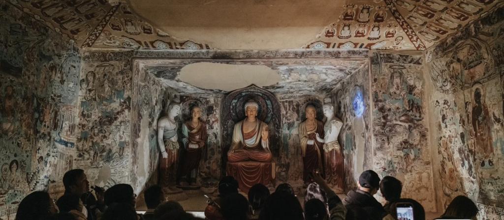 敦煌文化以敦煌莫高窟考古探究、文化艺术、文献保存为核心。这些石窟内的壁画充分展现了敦煌文化的兼收并蓄。这些壁画的艺术手法通过各种途径影响了中国古代文人的艺术创作。在今天,敦煌莫高窟内丰富的壁画资源已经成为我们认识中国古代绘画史的重要依据,实践队员深感其重要的文化价值。