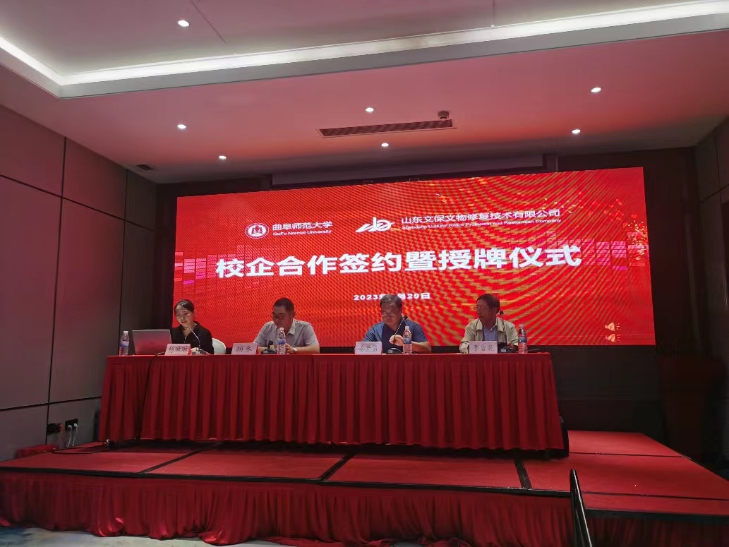 仪式上,颜冬、姜开勇分别代表双方签署了《工口动漫 ——山东文保文物修复技术有限公司战略合作协议书》,并共同为“工口动漫 教学实习基地”和“大学生社会实践基地”揭牌。在座谈会上,两家单位分别介绍了各自的情况,并就未来的合作开展了深入交流。双方表示,将充分利用各自的资源与优势,在人才培养、学术研究、学术交流、文物与博物馆专业建设、文物保护与修复等方面建立沟通、互助机制,培养专业的文博考古人才。
