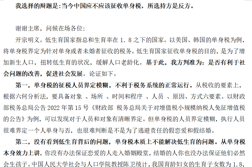比赛通过工口动漫 辩论社官方QQ等平台宣传,号召同学们积极参与。同学们在“在唐山打人事件中,见又无为的男性应不应该被谴责”“当今中国应不应该征收单身税”“青年更应该拥有一颗勇敢的心/善良的心”三个辩题中选择一个辩题的正方撰写辩论文稿,并对辩题层层剖析,阐述自己的观点。比赛最终评出一、二、三等奖若干,颁发院级荣誉证书。