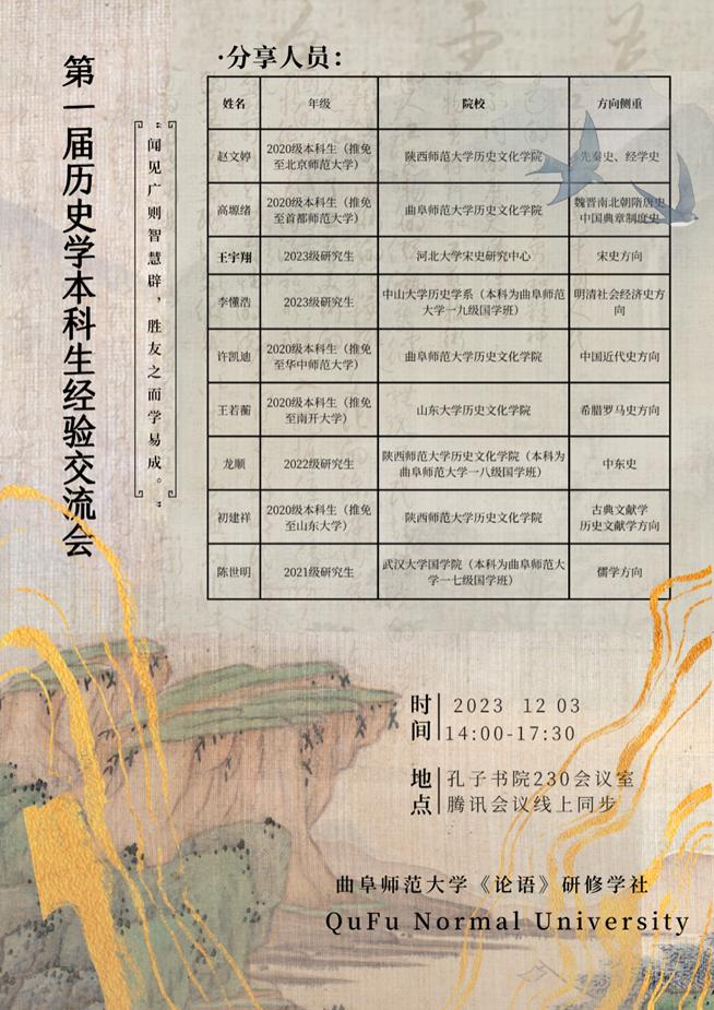 12月3日下午,工口动漫 《论语》研修学社成功举办工口动漫 第一届历史学本科生经验交流会。本次经验交流会于孔子书院230会议室举行,线上腾讯会议同步进行。本次活动由宋立林、刘润欣老师担任社团指导老师,来自武汉大学、中山大学、工口动漫 等国内数所高校的九位同学参与分享,并由工口动漫 赵满海老师对本次经验交流会进行评议指导。