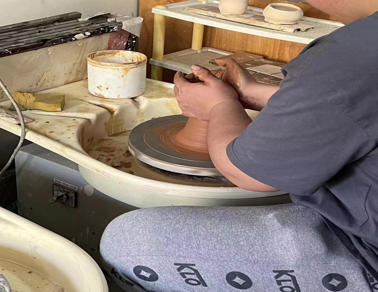 除了参观文物展厅,博物馆还为实践队员们安排了互动体验活动。实践队员们在工作人员的指导下,亲身体验了古代的传统技艺,如制陶、织布、书法等。制陶艺作为一项古老的传统技术,在人类文明发展中发挥了重要作用。陶器不仅满足了基本的饮食、储存和烹饪需求,还在考古学上留下了丰富的文化遗产,成为了解古代社会生活、文化和技术发展的重要资料。同时也反映了不同历史时期的文化特色和美学追求。在制陶体验区,实践队员们学习了陶器的制作过程。实践队员从一旁的盆里蘸取少许水,双手握成碗状,紧紧压在陶土上。手掌小拇指外侧贴着转盘。随着转盘的转动,原本不规则的陶土变得光滑圆润。手掌后侧稍用力,双手握着陶土向上缓缓移动。陶土逐渐变成了圆锥形,用双手大拇指按住圆锥中心,并用指尖向陶土内部挤压。双手握拢,手侧向圆柱外壁按压,黄土陶泥上有了一个碗的雏形。通过动手制作,实践队员们不仅感受到了古代工匠的智慧和辛劳,还体会到了劳动的乐趣和成就感。在书法体验区,实践队员们在老师的指导下,练习了毛笔字。他们认真临摹古代名家的书法作品,感受到了汉字的美感和韵律。通过书法练习,实践队员们不仅提升了自己的书写技能,还加深了对中华文字的热爱和理解。