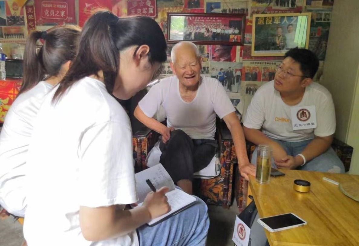 7月21日下午,实践队员们来到了李法珍老人的家中,尽管岁月已经在老人家的脸上刻下了深深的痕迹,但他的眼神依旧明亮,透露出一种不屈不挠的精神。在那个硝烟弥漫的年代,无数英勇的战士为了国家的自由和民族的尊严,投身于艰苦的抗战之中。李法珍老人,作为那段历史的见证者和亲历者,他的故事充满了沧桑和不屈。实践队员们希望通过采访,能够更真实地了解那段历史,感受抗战时期人民的坚韧和勇气。队员们围坐在李法珍老人的周围,安静地聆听着他讲述那些年的抗战故事。他回忆起自己年轻时,以及自己是如何在战火中成长,如何在艰苦的环境中坚守信念;他还讲述了自己和战友们如何在枪林弹雨中并肩作战,如何在物资匮乏的情况下依然保持乐观和希望。在交谈中,李法珍老人一遍遍向实践队员们强调的就是对和平的无比珍视,实践队员们也被他讲述的抗战故事深深打动,作为历史学专业的学生,这段峥嵘岁月不再只是书中的知识点,变得更加令人共情。他们认真记录下了每一个细节,希望能够将这些珍贵的历史记忆传承下去。通过这次采访,实践队员们不仅了解到了抗战时期人民的艰苦生活,更感受到了那种不屈不挠、勇于抗争的精神。