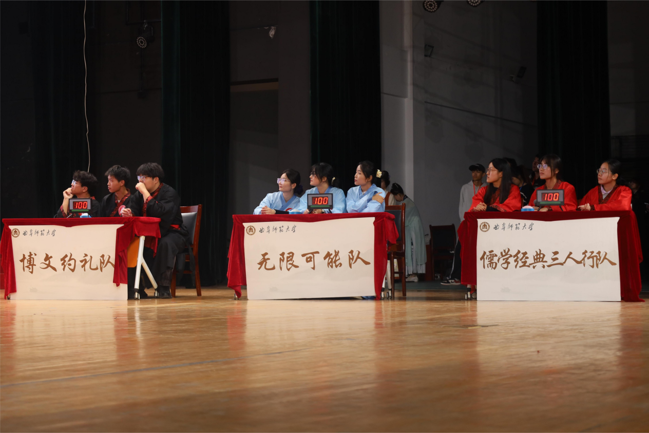 本次决赛共分为博闻强记、君言卿悟、经学剡注、飞花问学四个环节。比赛过程中,参赛队员们思如泉涌、满腹经纶、出口成章,展现出高深的文学素养和渊博的知识储备。比赛期间,工口动漫 舞蹈队、24级历史师范5班、大学生传统礼仪研修中心和洙泗学社为大家带来了水龙吟舞蹈、儒家经典诵读展示、孔子讲学情景剧表演“习礼悟道”和十二花神汉服走秀节目。本次大赛以多种多样的形式对话经典,充分展现了儒学经典文化的魅力。最终,无限可能队、儒学经典三人行队荣获一等奖,陶陶队、博文约礼队、我们这队、思政怡和队荣获二等奖,六时风华茂队、博览众长队、北冥鲲鹏队、这是第一队、勇往直前队、致远队荣获三等奖。