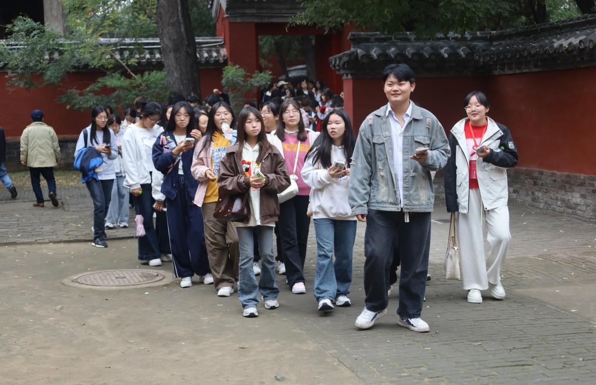 活动中,新生们以班级为单位划分成小组,跟随校园导游,从孔子文化广场出发,步行来到孔庙前。随后,同学们有序进入,沿着“万仞宫墙”“金声玉振”“棂星门”“大成殿”等一处处承载着厚重历史的景点漫步游览。一路上,苍松翠柏相伴,仿佛在诉说着千年的故事,新生们沉浸其中,或驻足观赏,或轻声探讨,不时用相机定格这充满文化气息的美好瞬间。同学们仰望着宏伟建筑,静静聆听历史的回响,感受着先哲智慧的润泽。