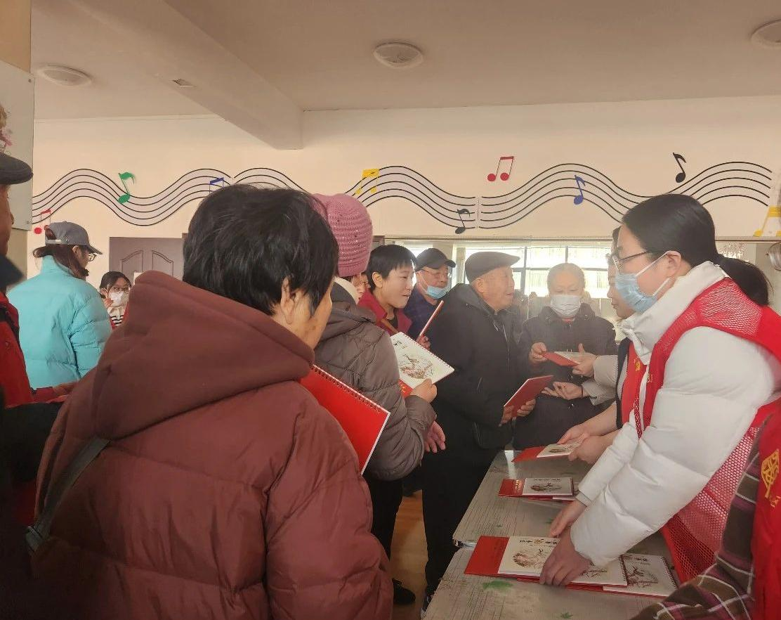 一本本崭新的台历整齐摆放在社区活动室,经过社区工作人员的精心设计,新年台历以大家喜爱的红色为主色,内容丰富、字体较大方便老党员们查看,并且正反面都可记录事项,不仅美观,而且实用。党员同志们一进门就纷纷自觉有序排起了小长队。实践队员们把一份份蕴含喜庆和祝福的红色台历送到他们手中,党员们收到台历时开心地说“我们老一辈人还是喜欢翻看这种台历类的实体日历,真是太实用了”。大家拿着台历笑逐颜开,台历虽小,却拉近了社区与居民的距离,传递了社区暖暖的爱,老党员们的一张张欣慰笑容也让实践队员们和社区工作者感受到欣慰与幸福。